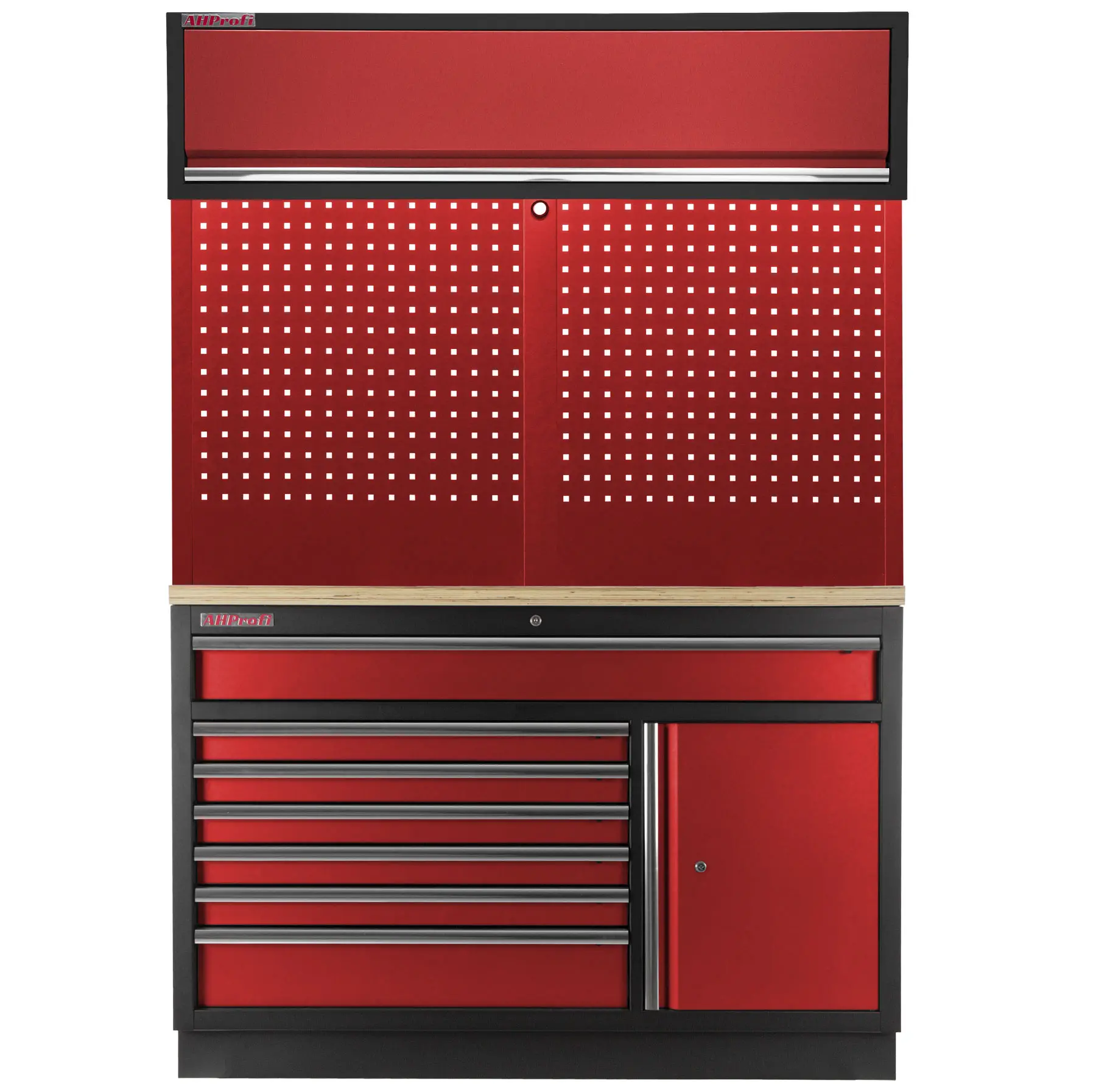 Dielenský nábytok PROFI RED s drevenou doskou zaujme moderným a profesionálnym vzhľadom. Kombinácia červenej RAL 3031 a čiernej RAL 9004 sa bude vynímať v každej garáži aj dielni. Zostava nábytku v sebe skrýva dostatočné množstvo úložného priestoru pre vaše náradie, autotechniku aj dielenské vybavenie. V kombinácii s robustnou pracovnou doskou získate multifunkčnú stenu, s ktorou vám práca pôjde od ruky vo všetkých smeroch. Jednotlivé komponenty sú plne konfigurovateľné, zostavu je možné podľa vašich potrieb rozšíriť o ďalšie skrine, regály aj pracovné stoly.Zostava nábytku RTGC1371BAL