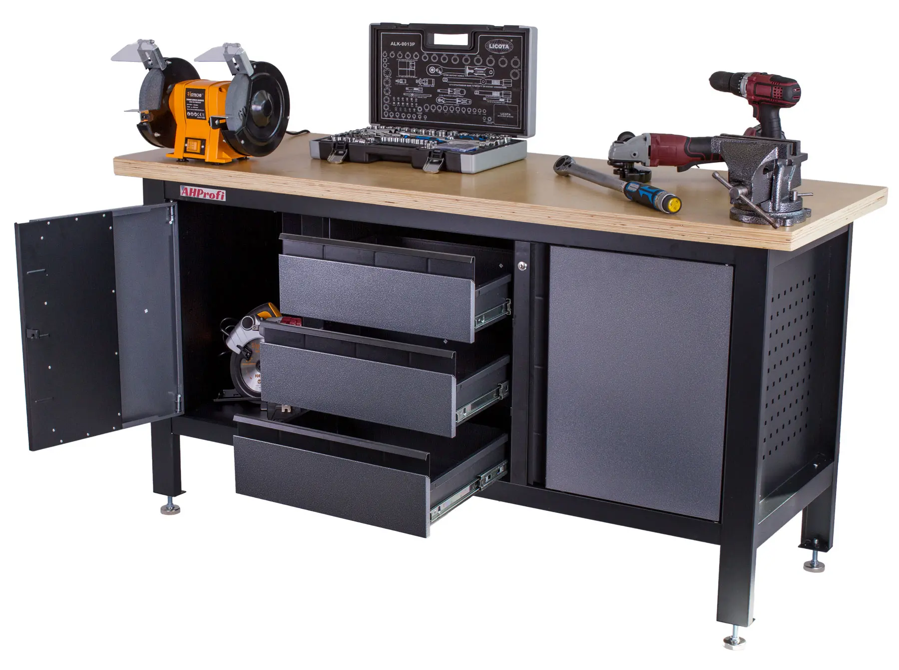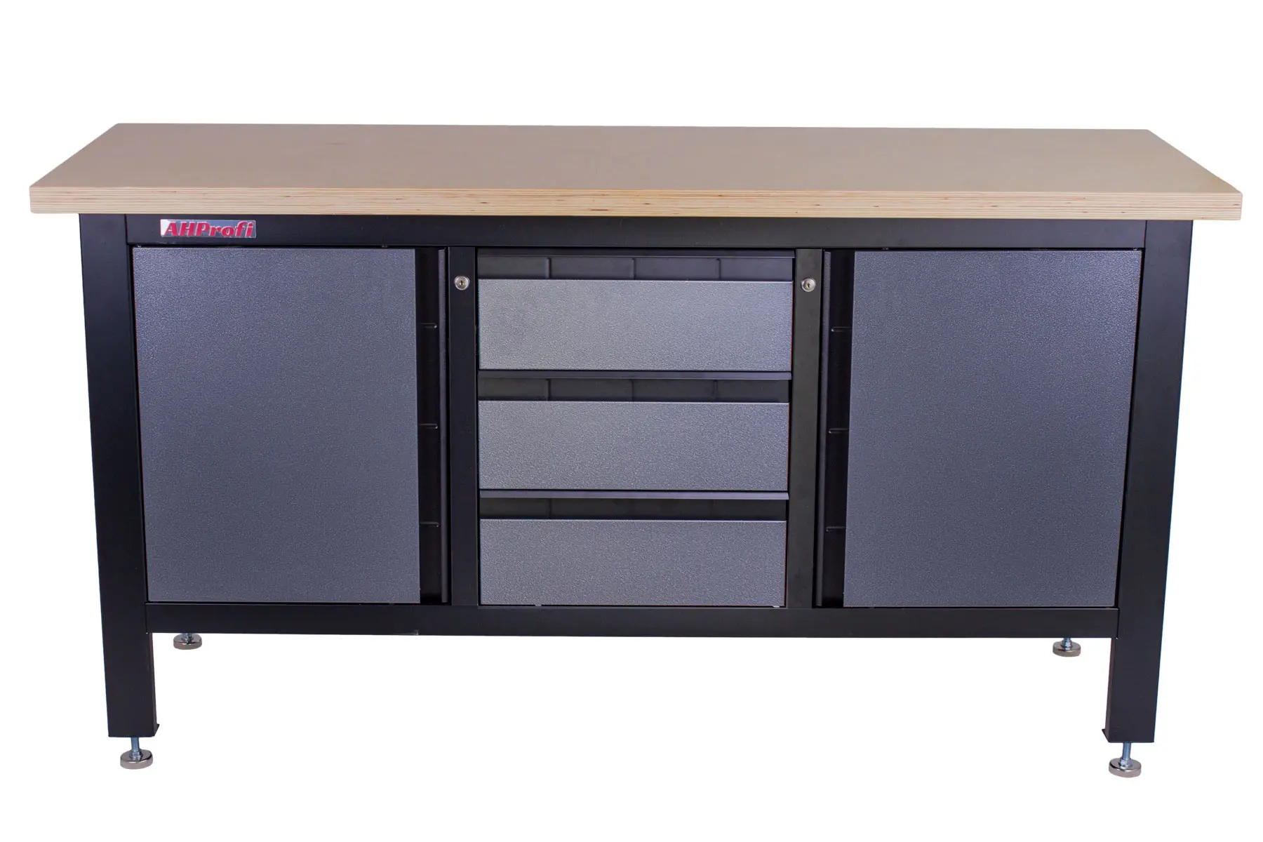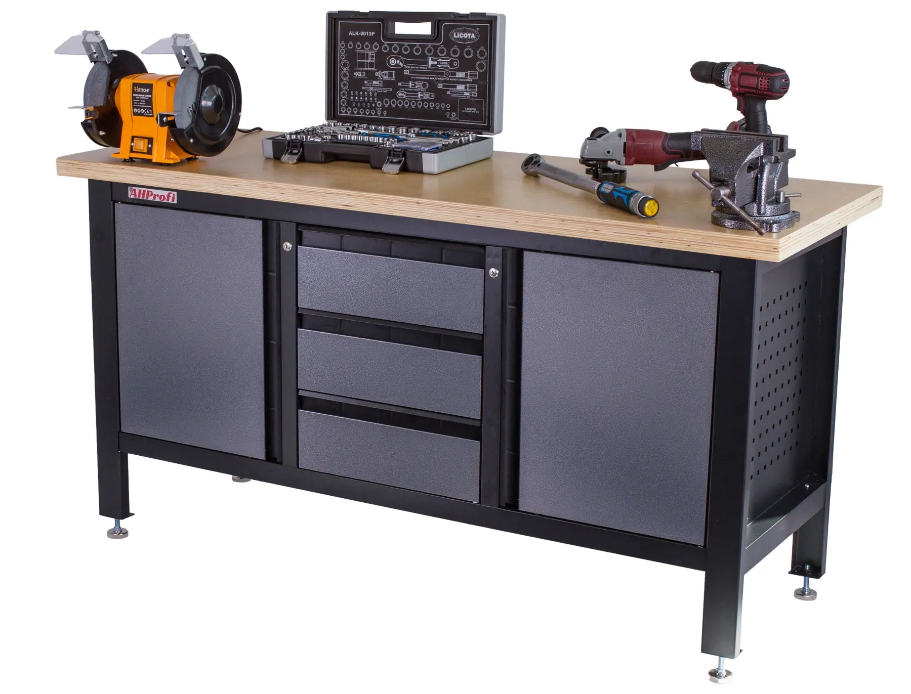 Profesionálny kovový ponk vhodný pre najnáročnejšie použitie. Nosnosť pracovného stola je 300 kg. Je vybavený drevenou pracovnou doskou o rozmeroch 1690 x 600 mm, dve skriňky a 3 šuplíky.