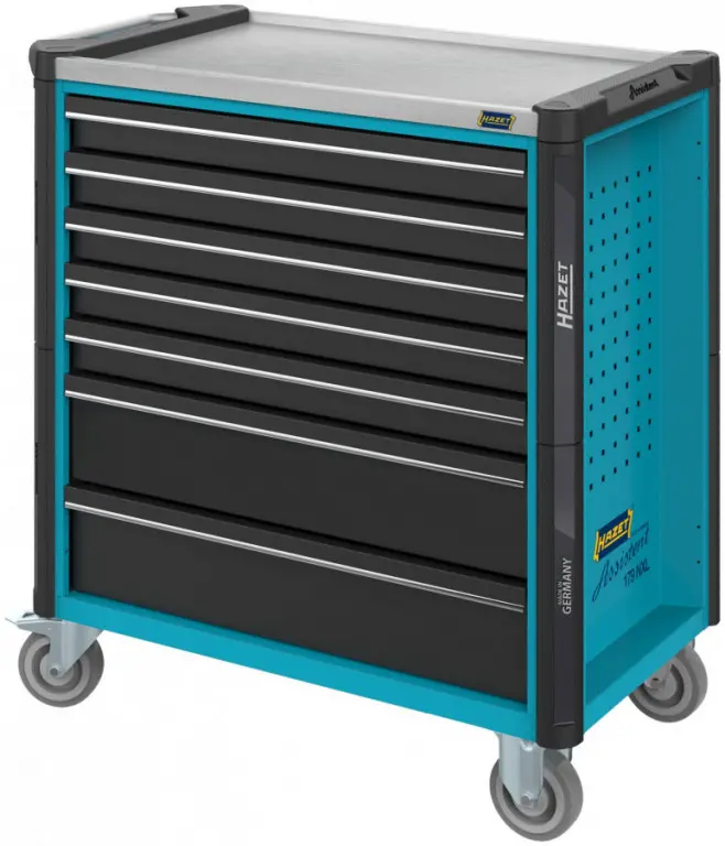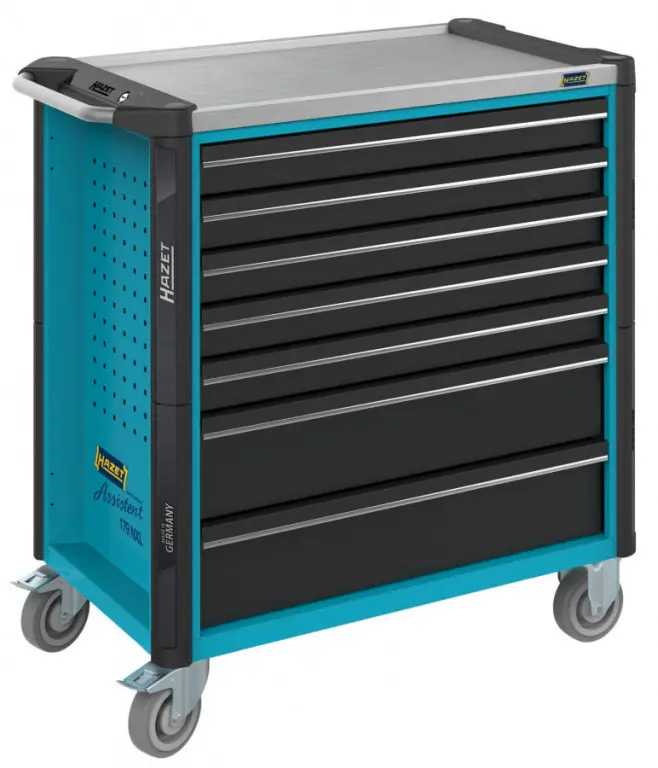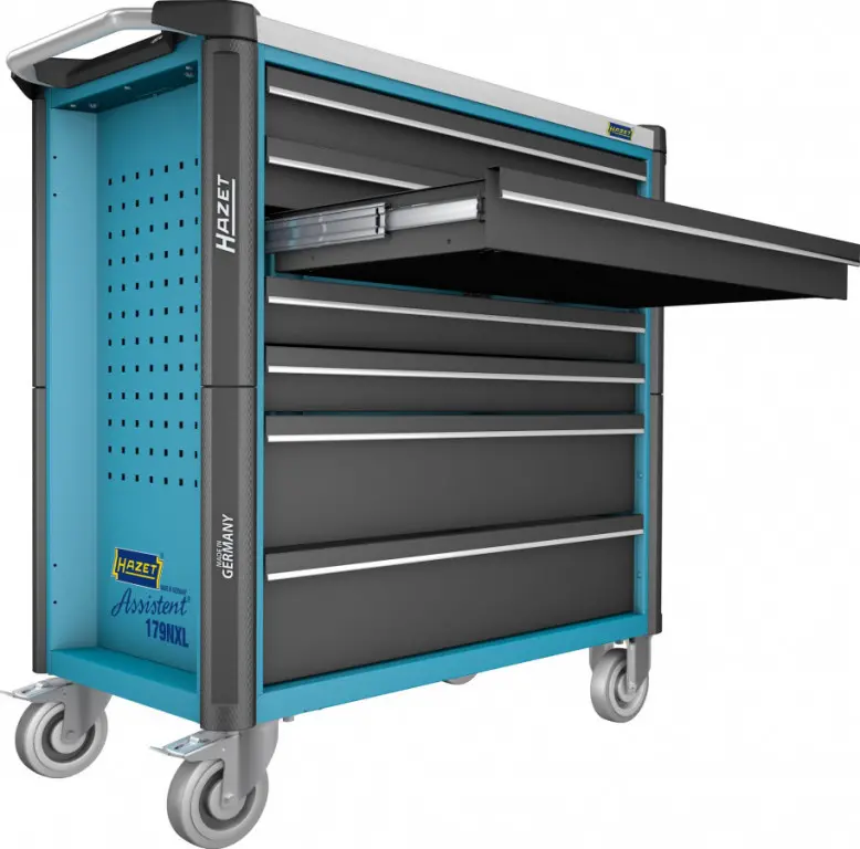 Dielenský vozík s robustnou konštrukciou z oceľového plechu so siedmimi zásuvkami, ktoré sú osadené vodiacimi lištami s guličkovými ložiskami.