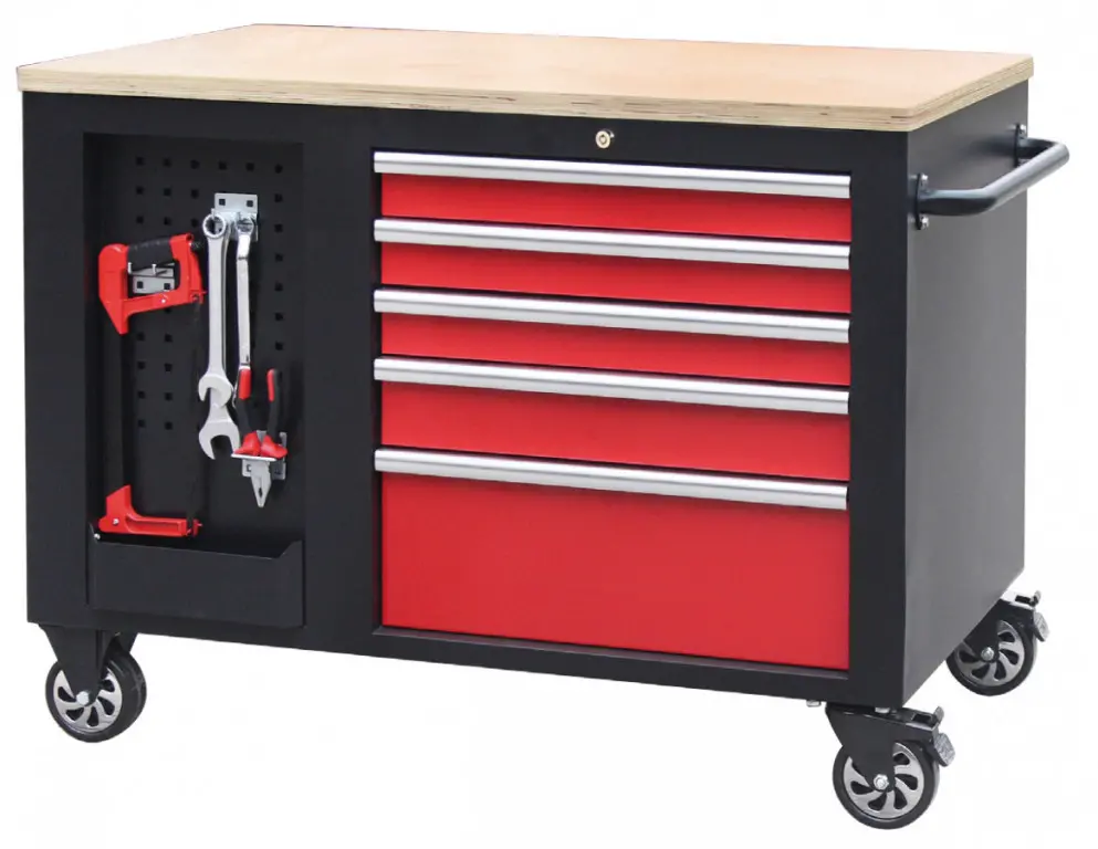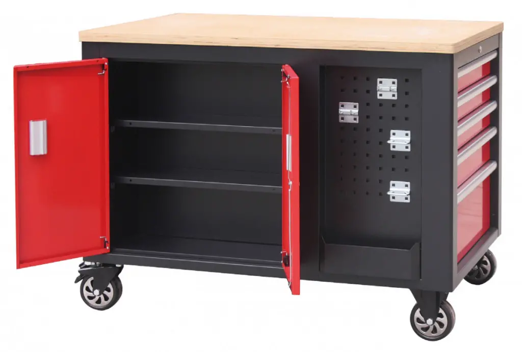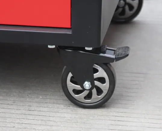 Čierno-červený veľký dielenský vozík s 10-ti zásuvkami o rozmeroch (š x h x v): 1141 x 730 x 888 mm. Vozík je zamykateľný, má 2 pevné a 2 otočné pogumované kolieska a je doslova všestranný. Uskladňovacie priestory má zo všetkých strán!