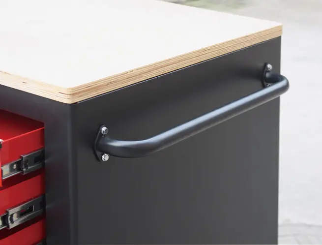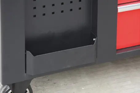 Na širších stranách vozíkov sú 2x dierované dosky s priehradkou, z jednej strany 5 zásuvok a z druhej dvojkrídlová skrinka s 2-mi poličkami. Na užších stranách sa nachádza ďalších 5 zásuvok a madlo pre ľahšie manipulovanie s dielenským vozíkom.