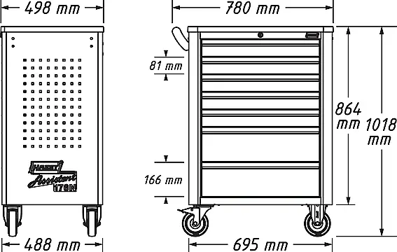 Vozík disponuje 7 zásuvkami, z ktorých 5 je nízkych a 2 vysoké, čo zaisťuje dostatok priestoru na uloženie 193-dielnej sady náradia.