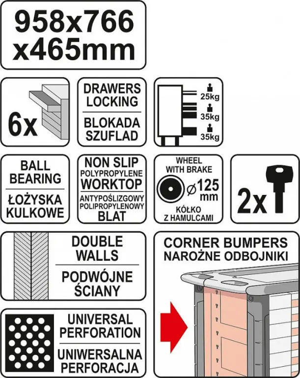 Skrinka s rozmermi 958 x 766 x 465 mm je zhotovená z ocele, celková nosnosť činí 450 kg. Prvé 3x horné zásuvky majú nosnosť po 25 kg, a spodné 3 zásuvky majú nosnosť 35 kg.