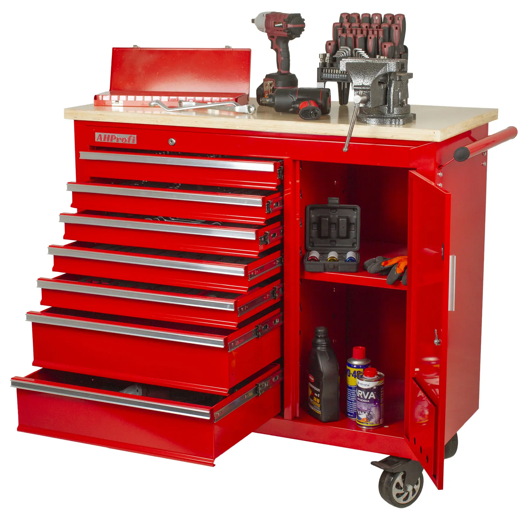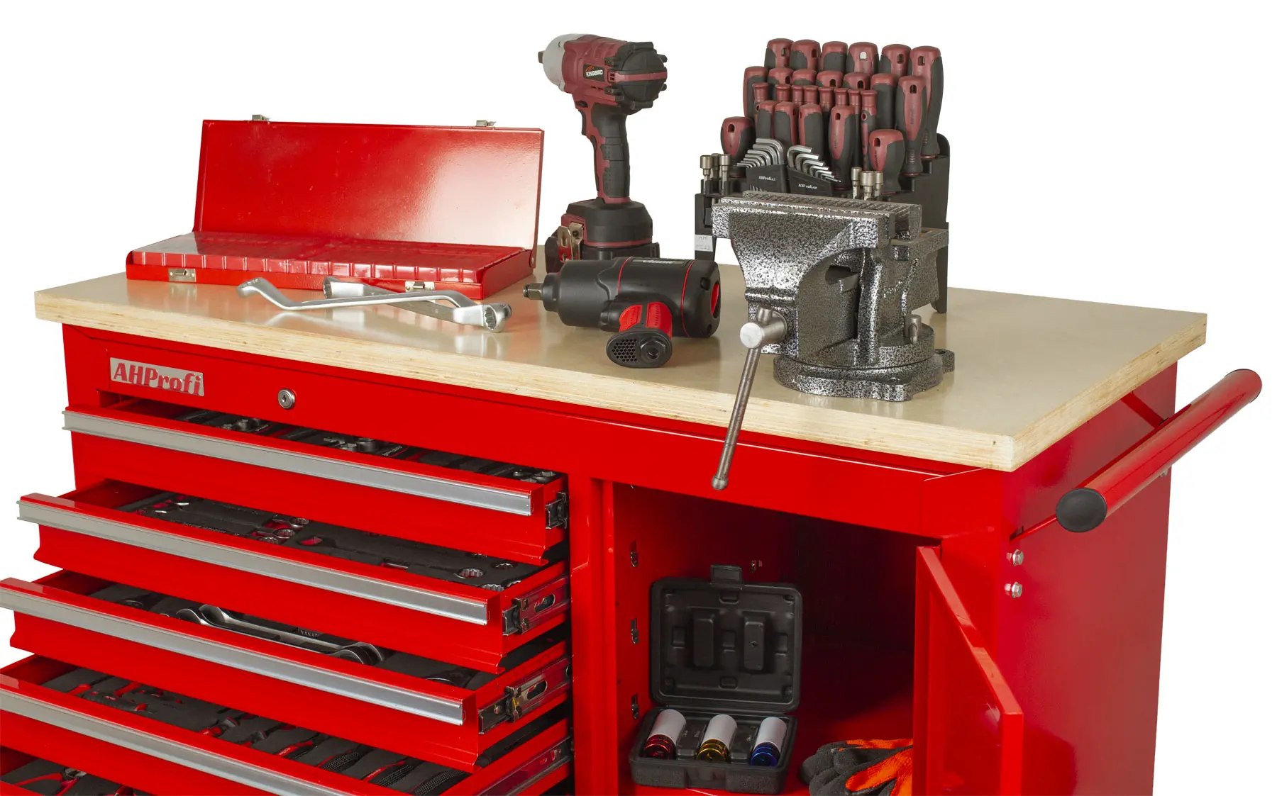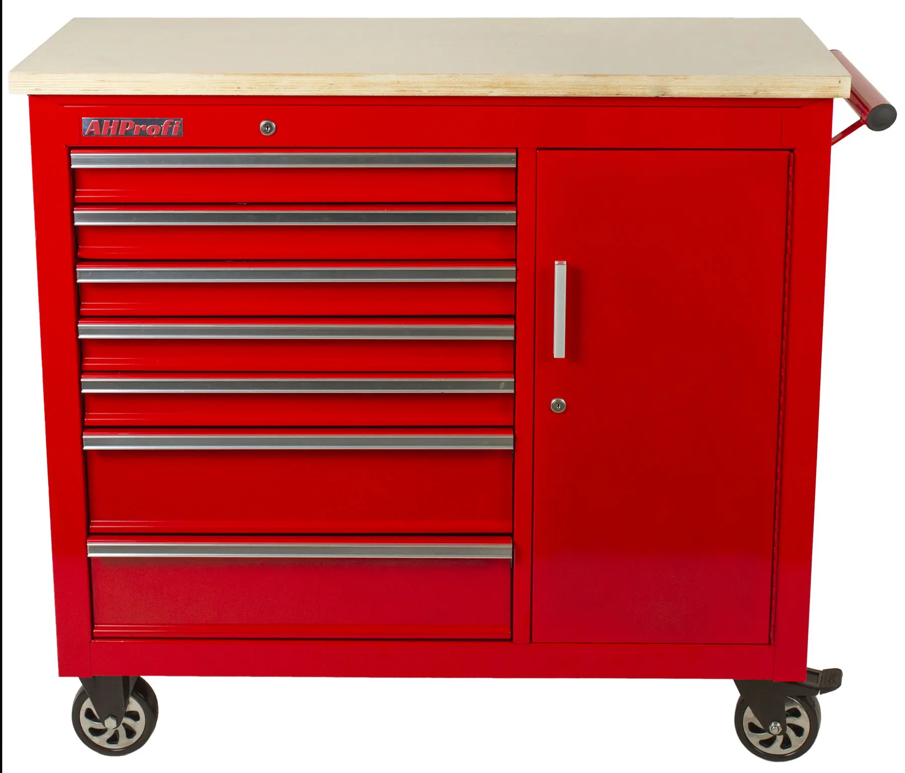 Červený kovový dielenský vozík se 7 šuplíkmi a skrinkou. Vozík je vhodný na výbavenie náradia nevyhnutného pre prácu v dielni alebo servise