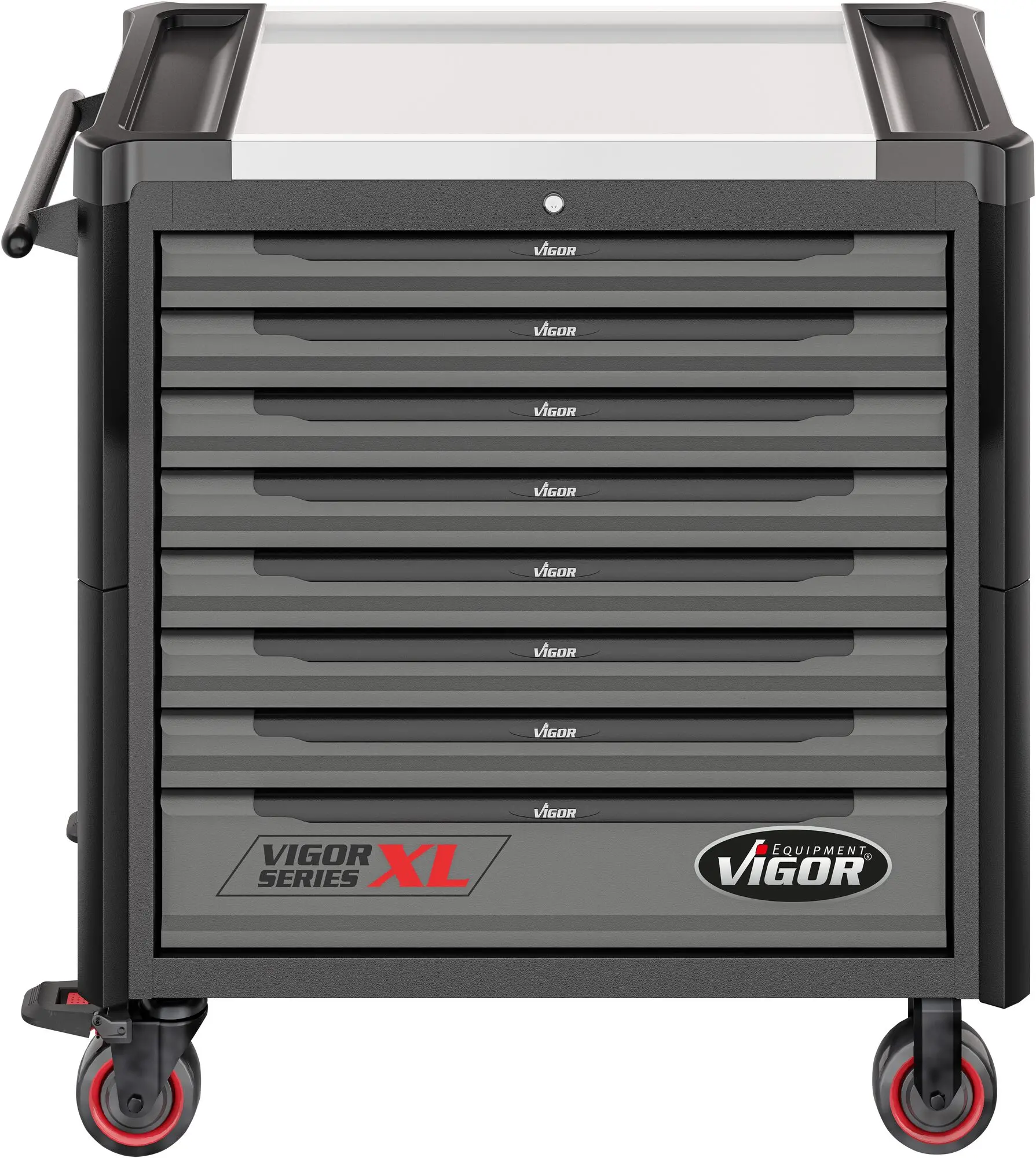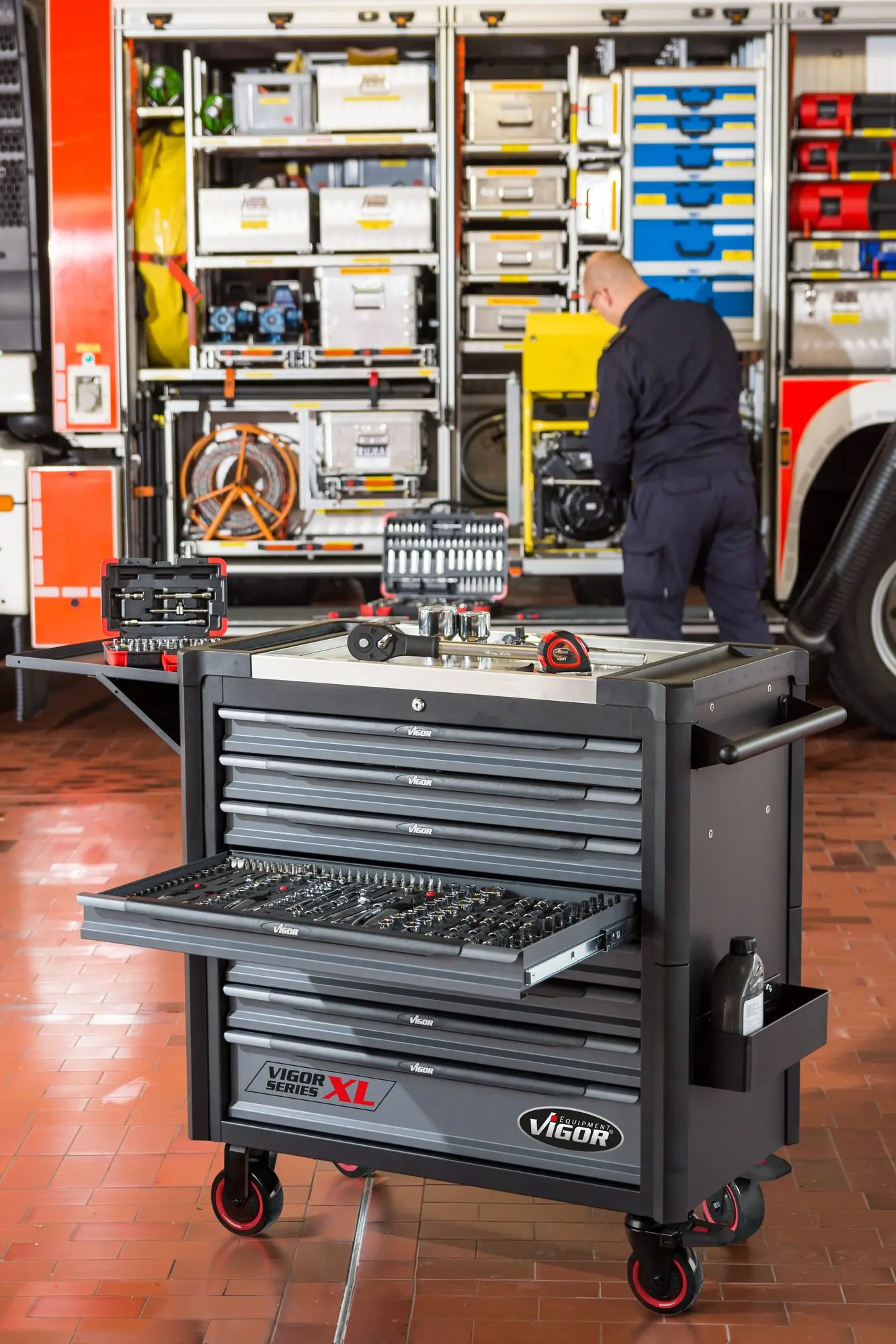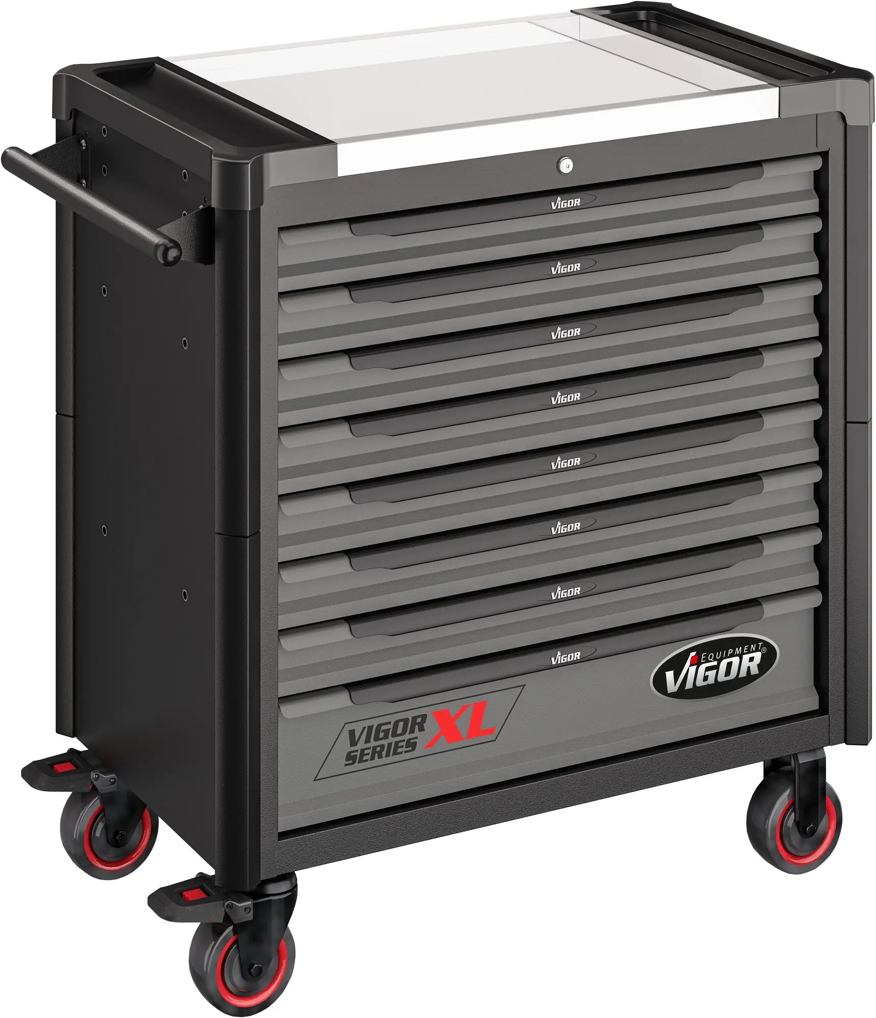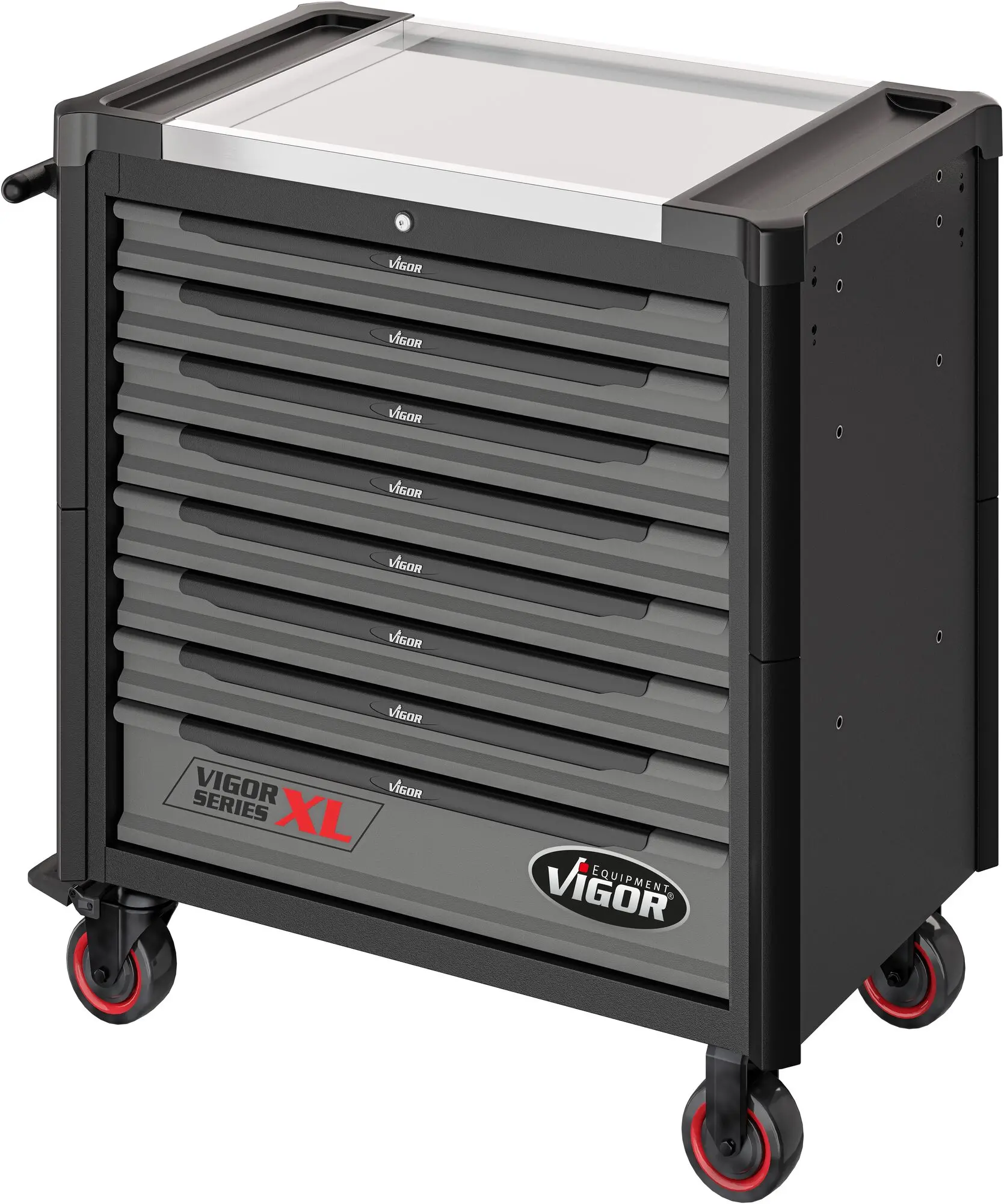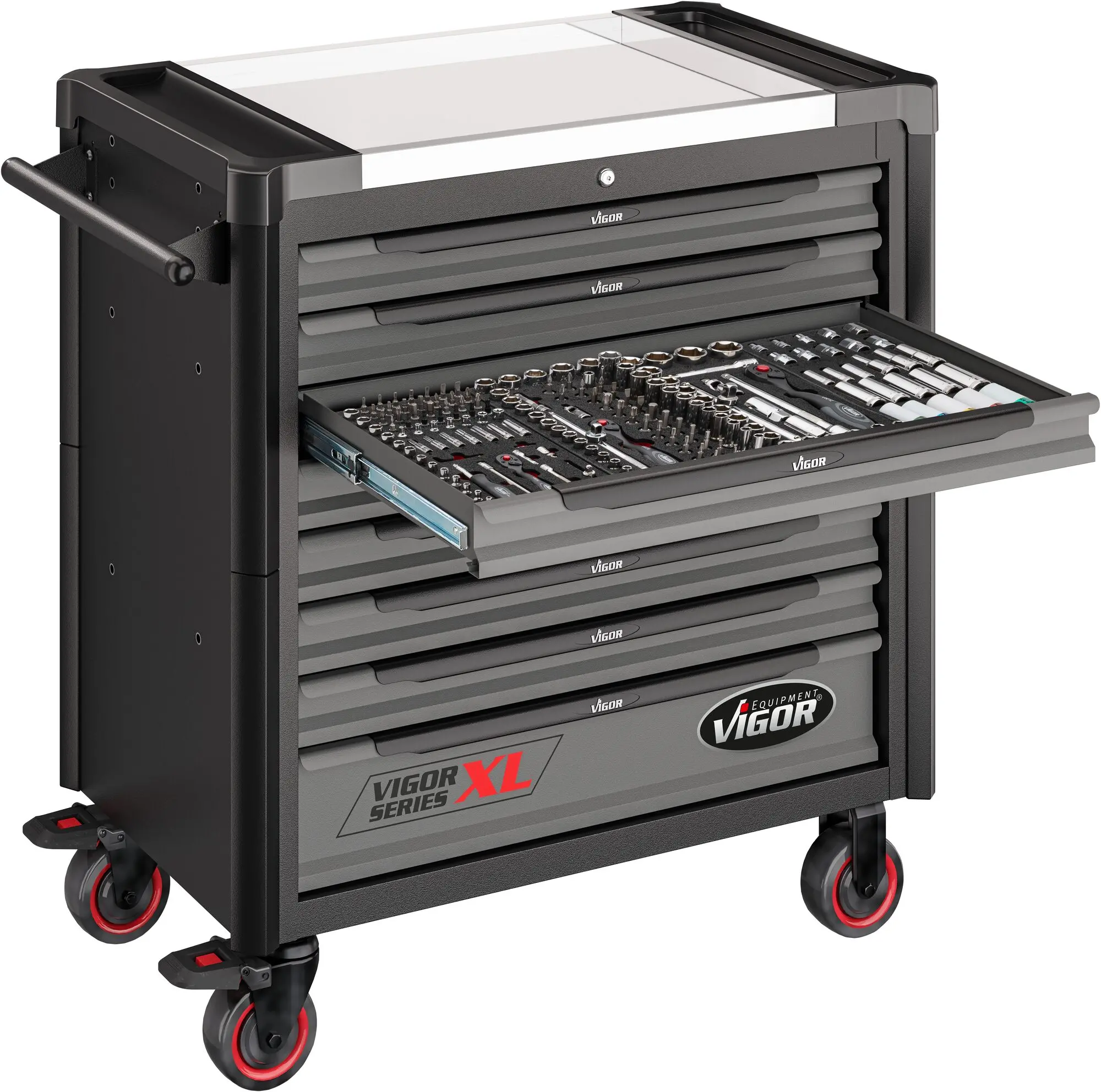 Súčasťou vozíka je 8 uzamykateľných zásuviek pre uloženie výplní dielenského vozíka s ručným náradím. Zásuvky sú osadené guličkovými ložiskami v jazdcoch, čím sa zvyšuje ich nosnosť bez vplyvu na výbornú vlastnosť vychádzania / státia.