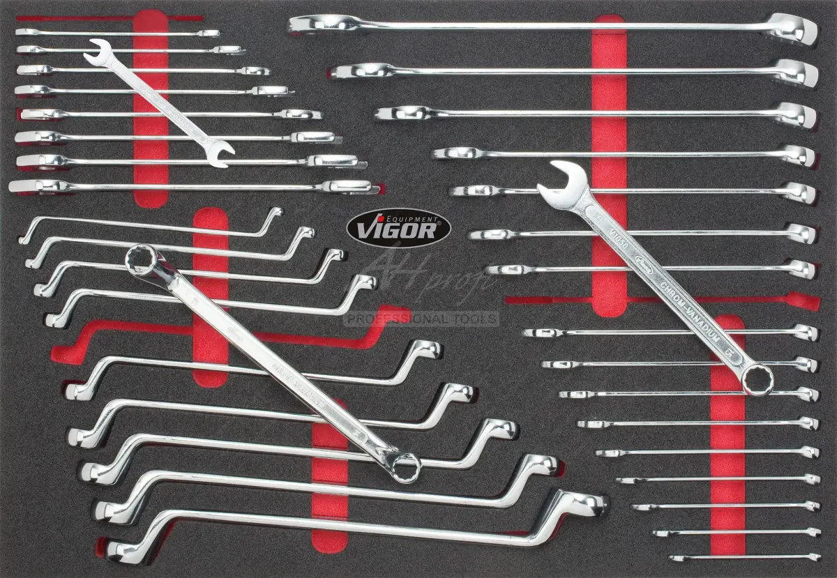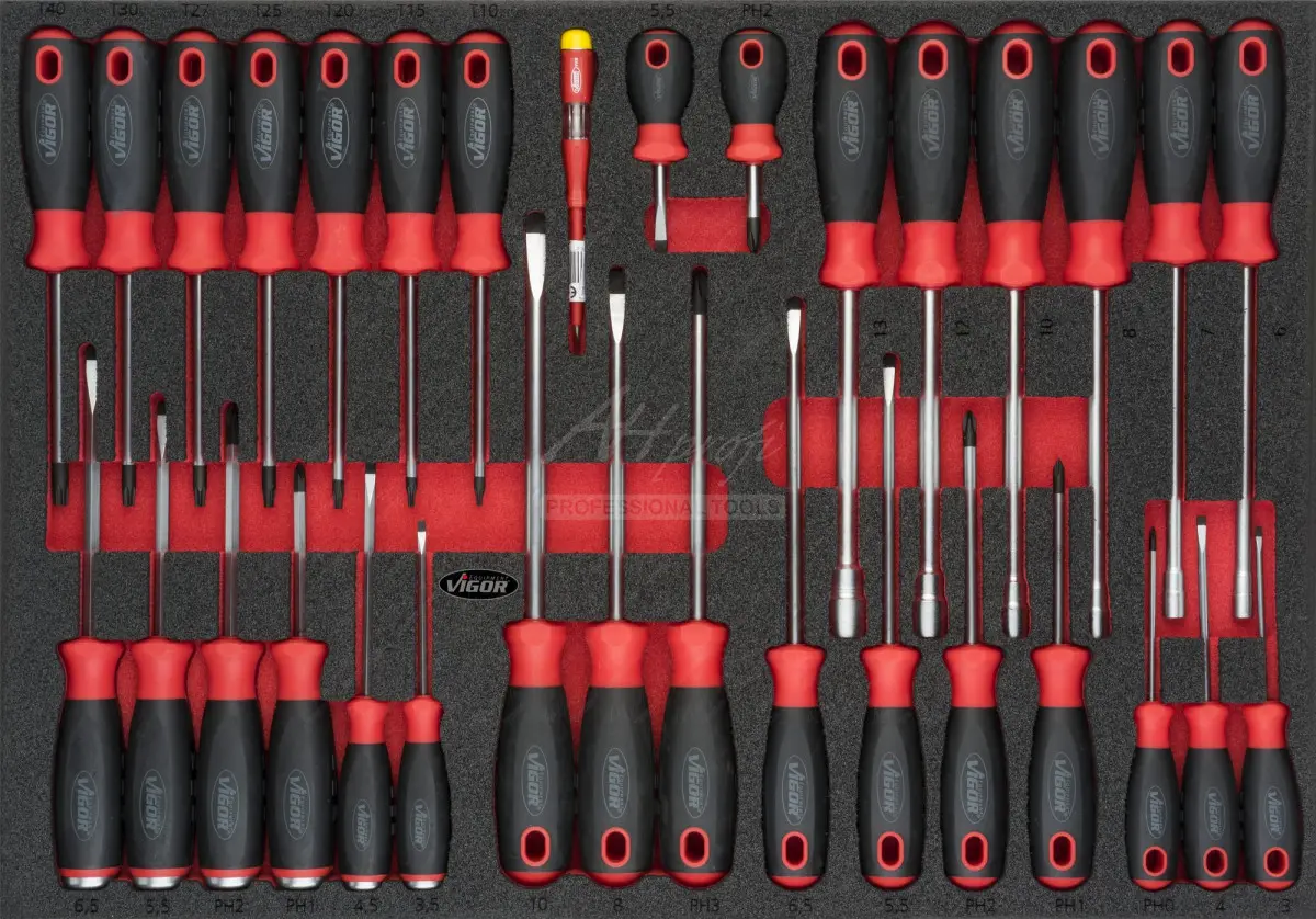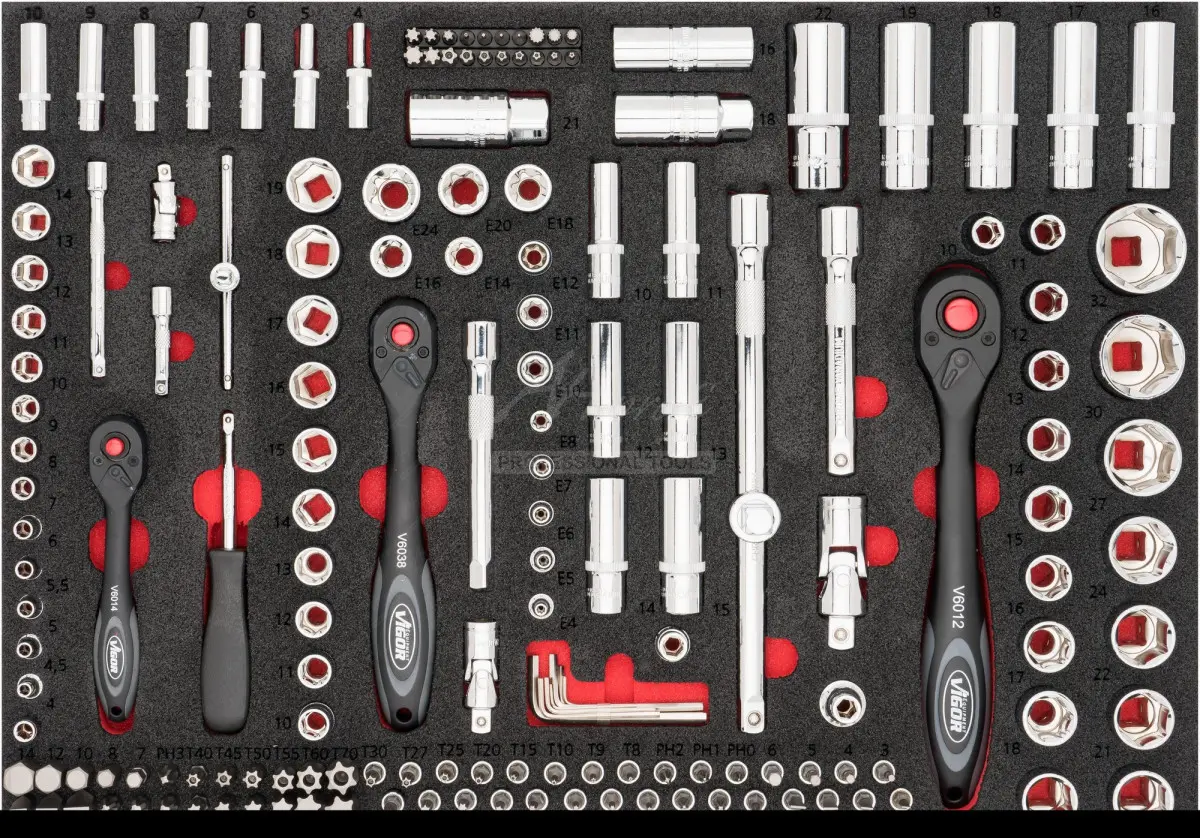 V 7 zásuvkách sú penové výplne dielenských vozíkov s bežne používaným náradím v profesionálnej kvalite. V sadách náradia nájdete golu 1/4 ", 1/2", 3/8 ", nástrčkové kľúče, sadu klieští, kladivo a paličku, veľkú sadu skrutkovačov (klasické, elektrikárske i hodinárske), imbus, veľkú sadu kľúčov a mnoho ďalšieho.