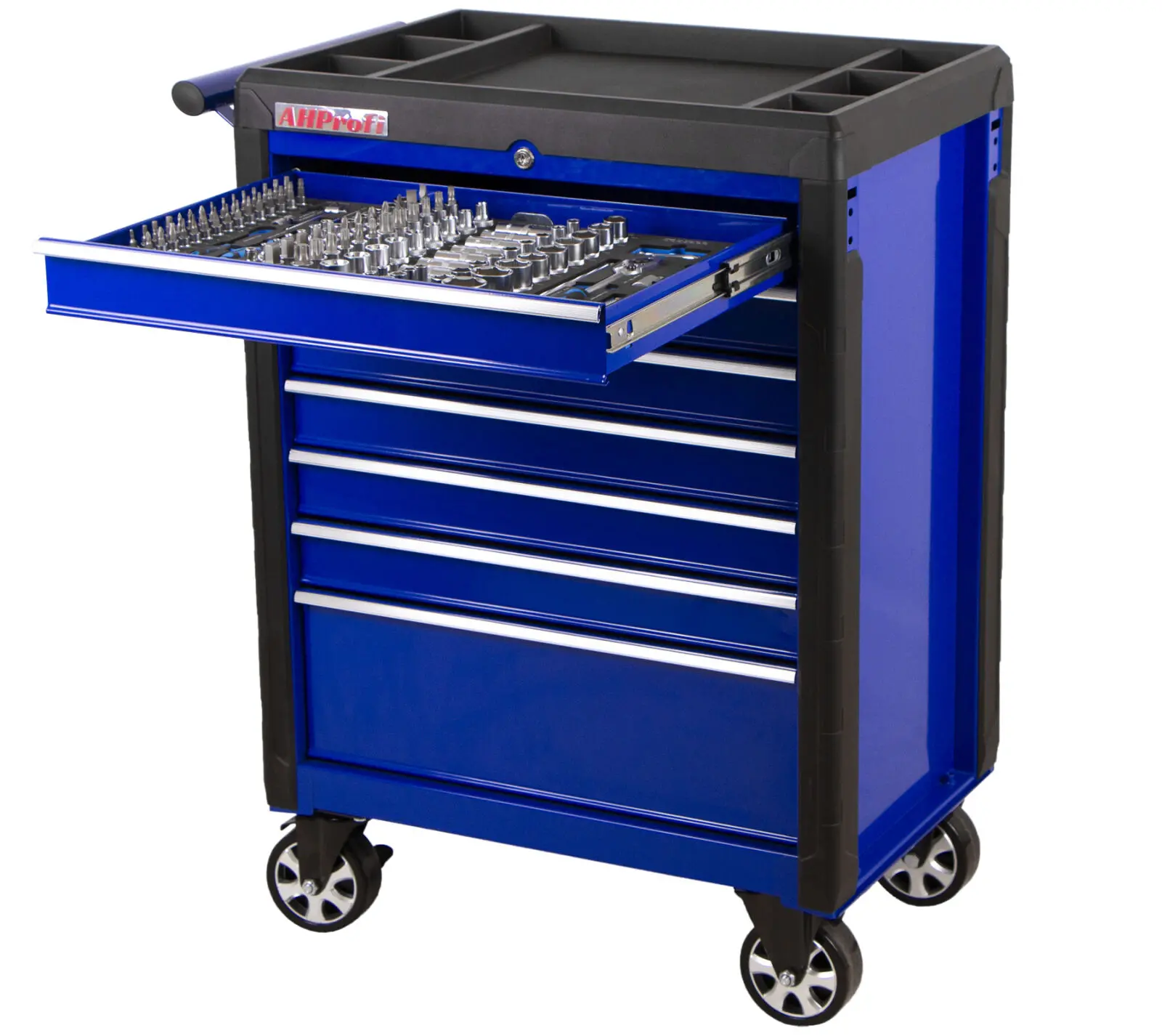 Pojazdný kovový dielenský vozík so 7 šuplíkmi vybavených 228 ks PROFI náradia v penových výplniach pre najnáročnejšie použitie v servisoch a dielňach.