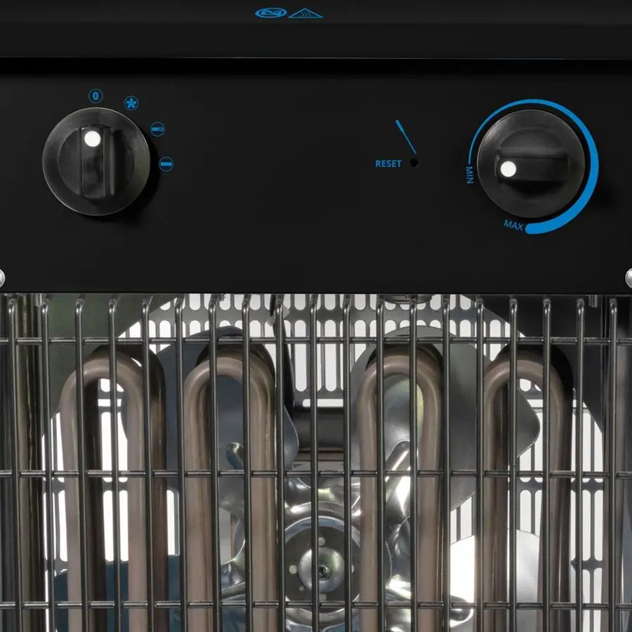 Max. topný výkon: 9 kW (→ 7.740 kcal/hod., 2 topné stupně: 4,5 kW/9 kW), prostorový termostat (→ automatické zapínání/vypínání topné spirály po dosažení nastavené teploty), ventilátor.