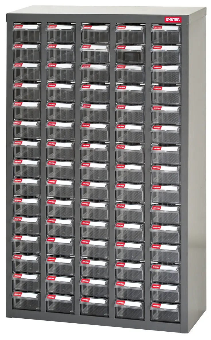 Galvanizovaný zakladač montážneho materiálu a náradia s celkom 75 priehľadnými plastovými zásuvka...