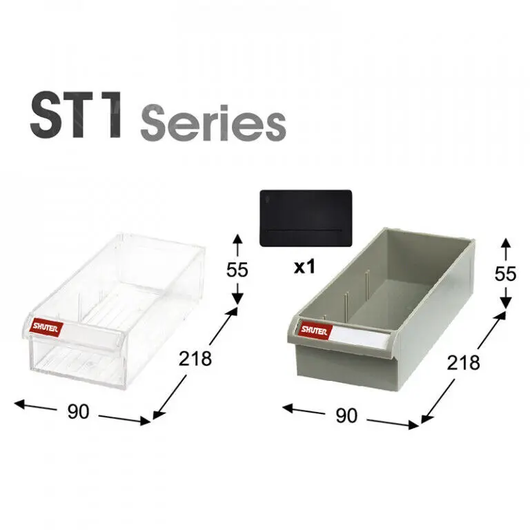 Jednotlivé plne priehladné plastové boxy majú rozmer (š x v x h) 90 x 55 x 218 mm, objemu 1 l a maximálnou nosnosťou 5 kg.