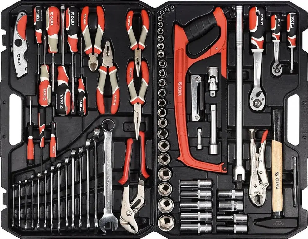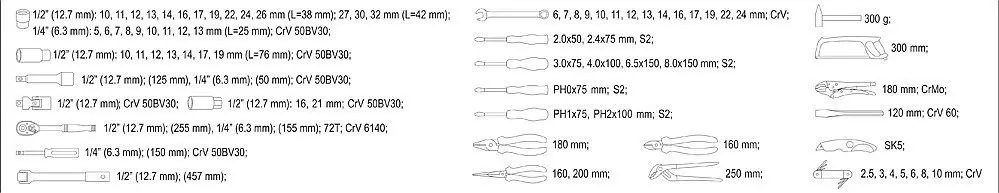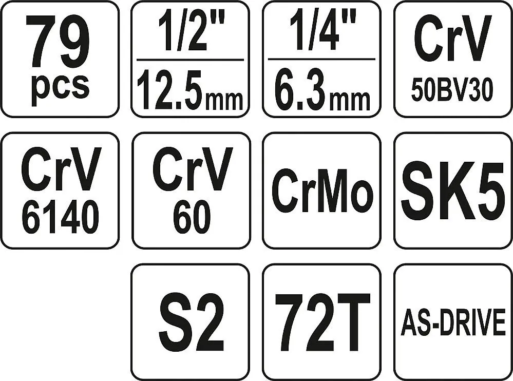 Gola sada 1/2 ", 1/4" obsahuje 79 ks: nástavcov, predlžovacích nástavcov, račne s plastovou rukoväťou, kĺbové nadstavce očkoploché kľúče, kliešte, kladivo a ďalšie príslušenstvo. Vyrobené z kvalitnej chromvanadiové a chromolybdenovej ocele CrV6140, CrV50BV30, CrV60, CrMo a S2 s funkciou AS-DRIVE.