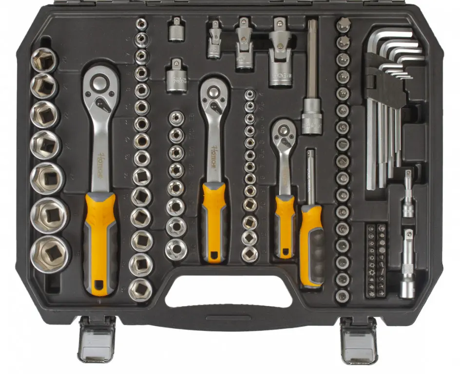 Sada obsahuje račne 1/4", 3/8" a 1/2", nástrčné kľúče, predĺženie, kardanové kĺby, očkoploché kľúče a mnoho ďalšieho.