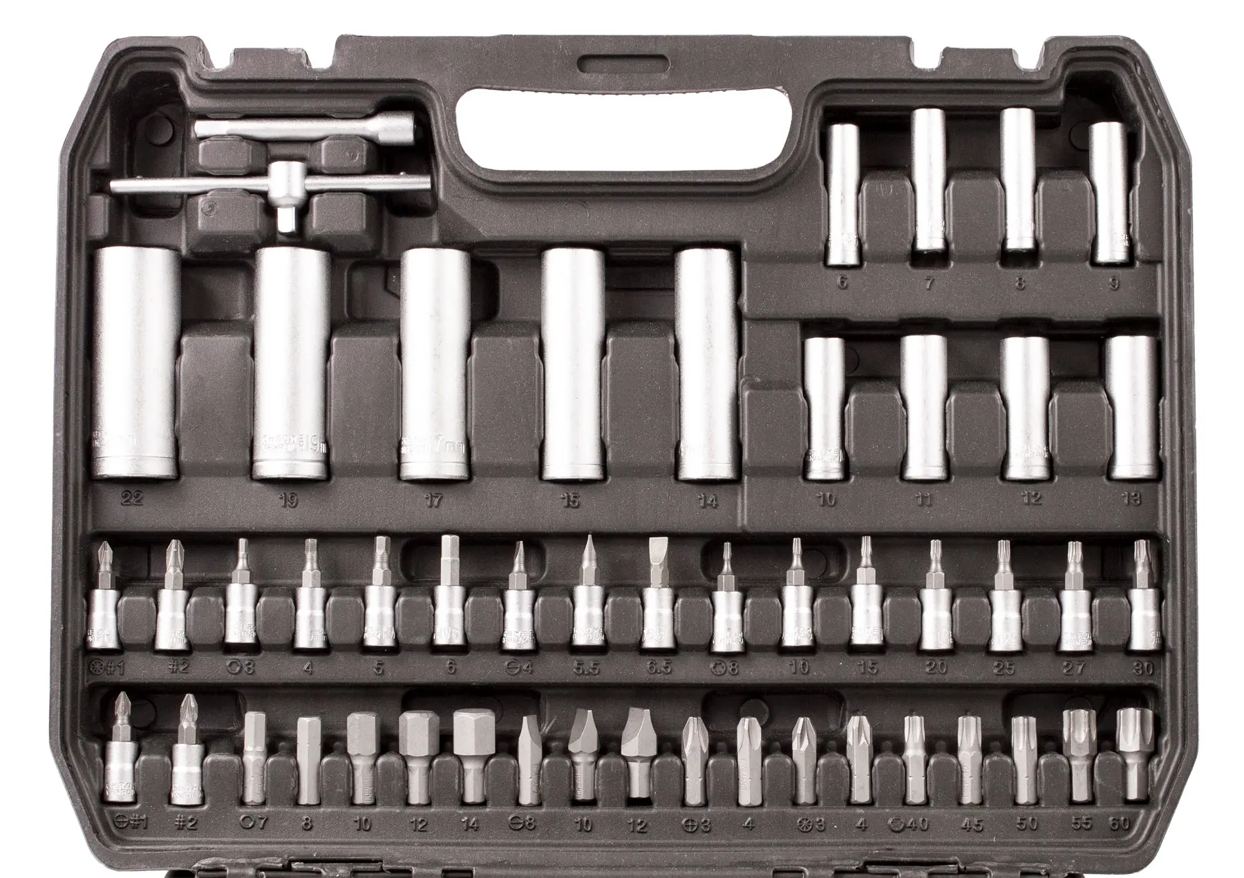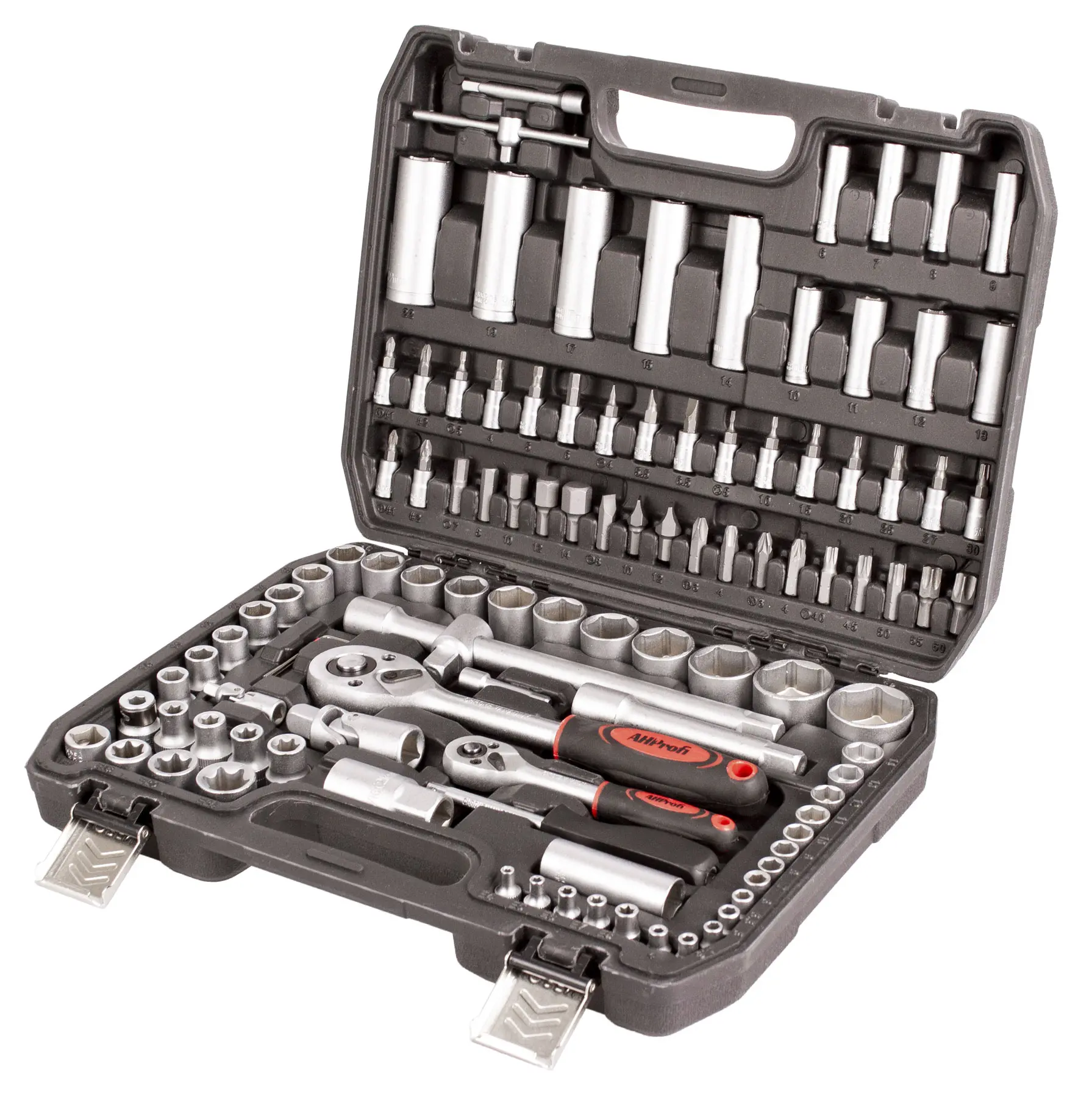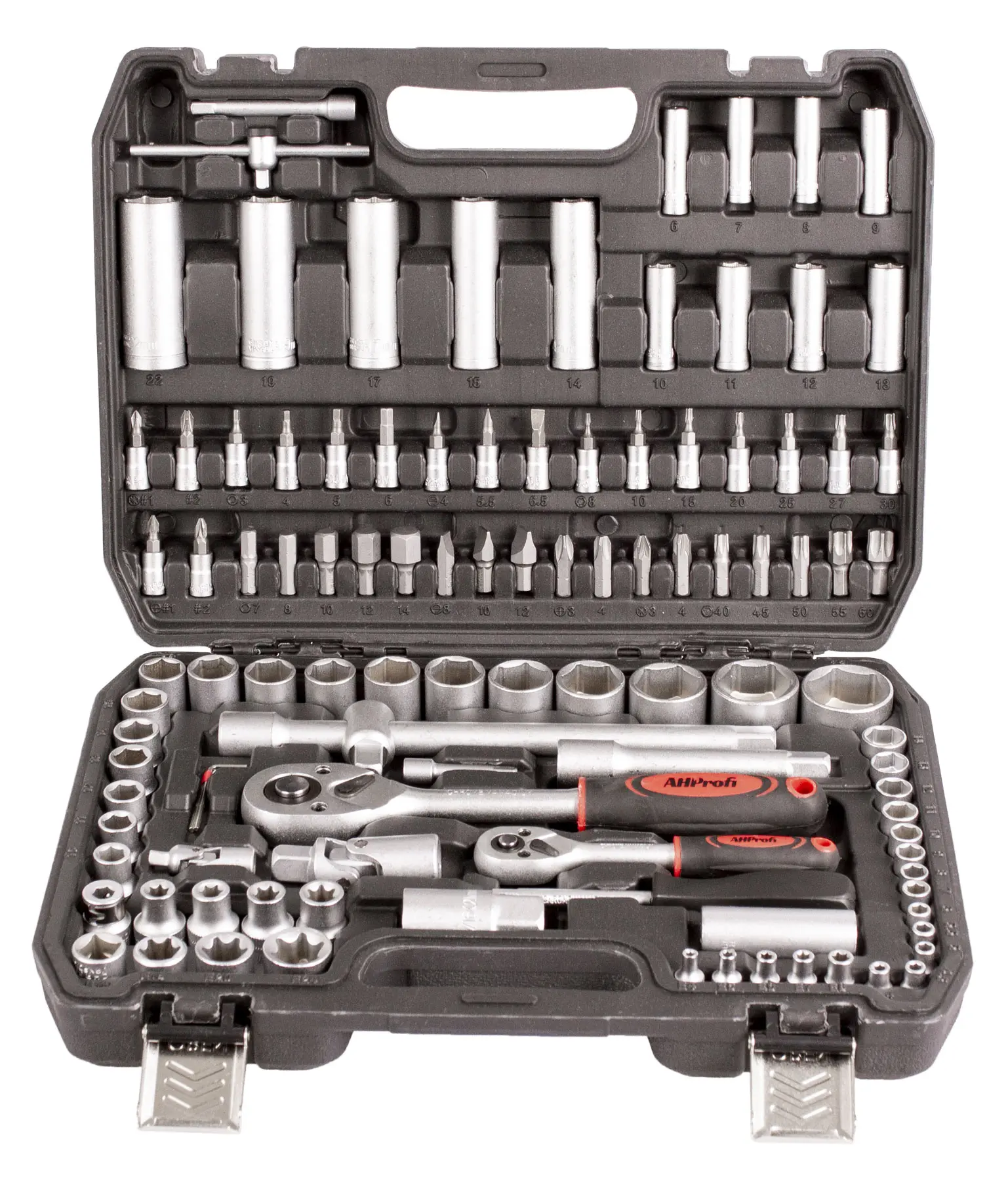 Gola sada je zložená zo 108 dielov. Obsahuje 2 račny, orechy, bity a ďalšie diely s najpoužívanejšími rozmermi 1/2" a 1/4". Náradie je vyrobené z Cr-V ocele a je uložené v plastovom kufri. Celú sadu tak môžete jednoducho preniesť.