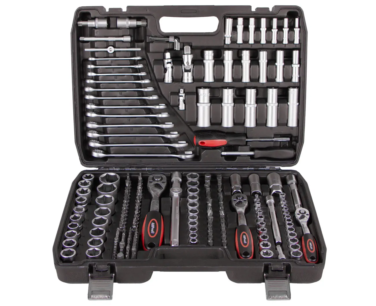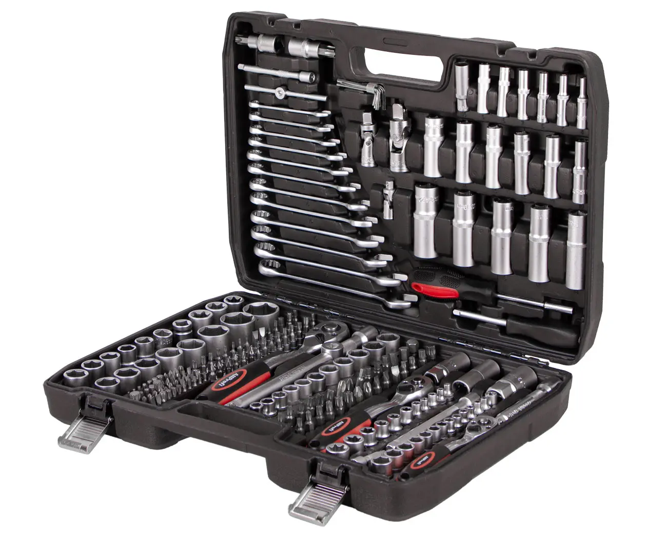 Sada náradia je umiestnená v čiernom plastovom kufri s červenými doplnkami.