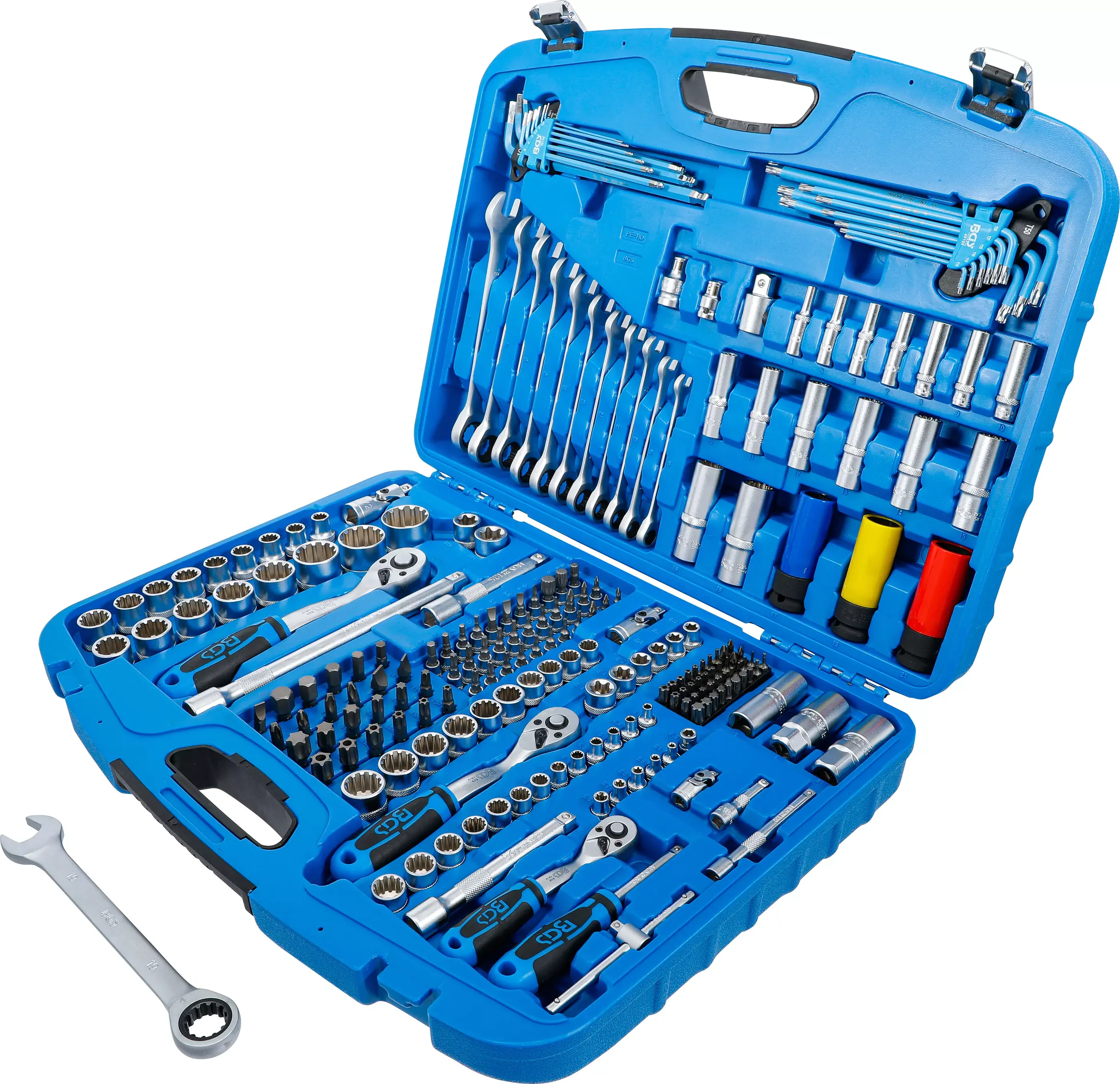 Kvalitná gola sada 1/2", 3/8", 1/4" obsahuje račne, nástrčné kľúče s profilom Gear Lock, bity, račňové kľúče a ďalšie.