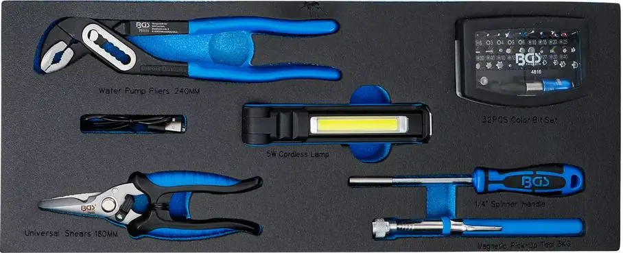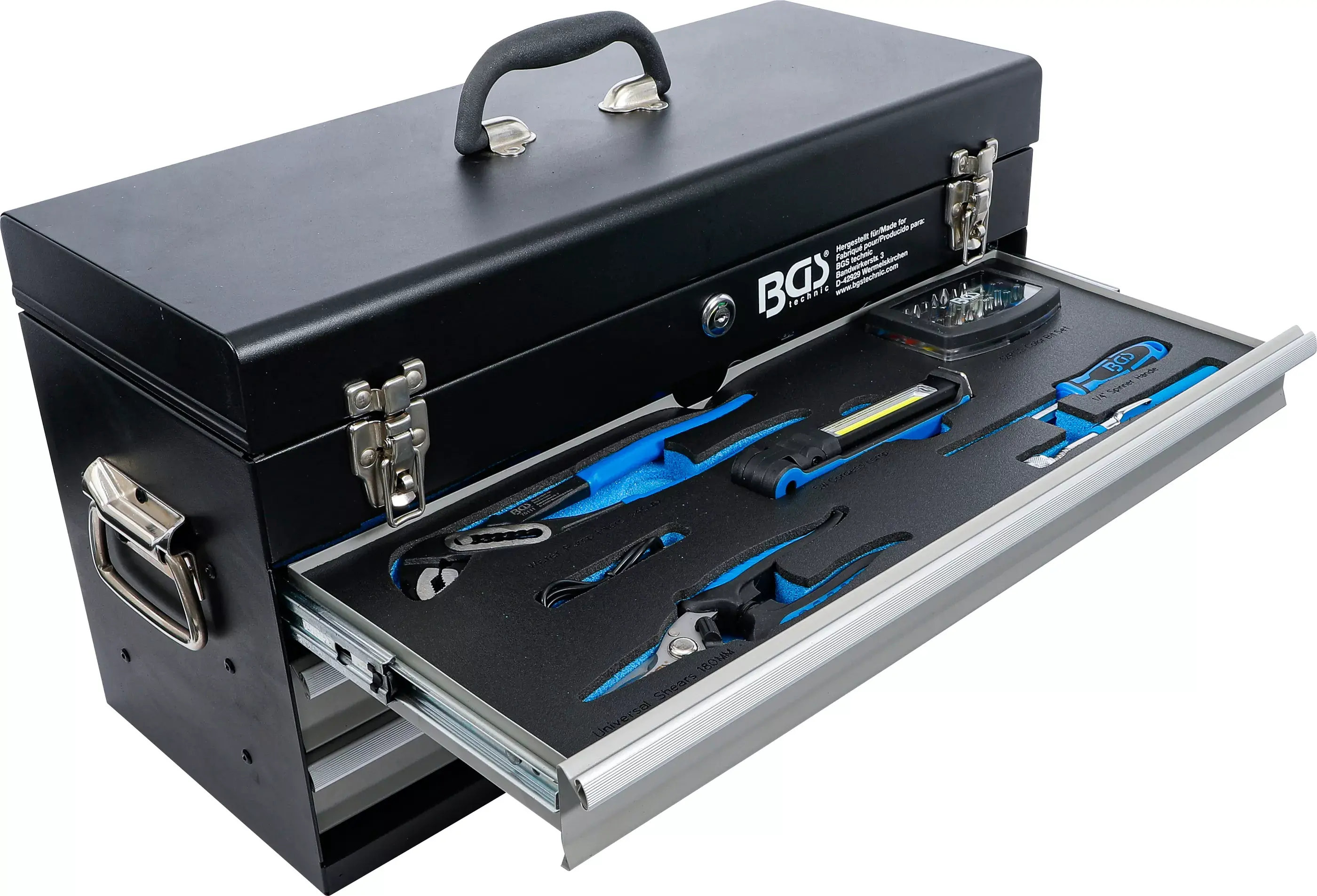 Sada obsahuje široký výber ručného náradia vrátane izolovaných nástrojov testovaných podľa normy DIN EN/IEC 60900. Všetko je uložené v pevnom kovovom kufri s 3 zásuvkami a hornou priehradkou s vekom.