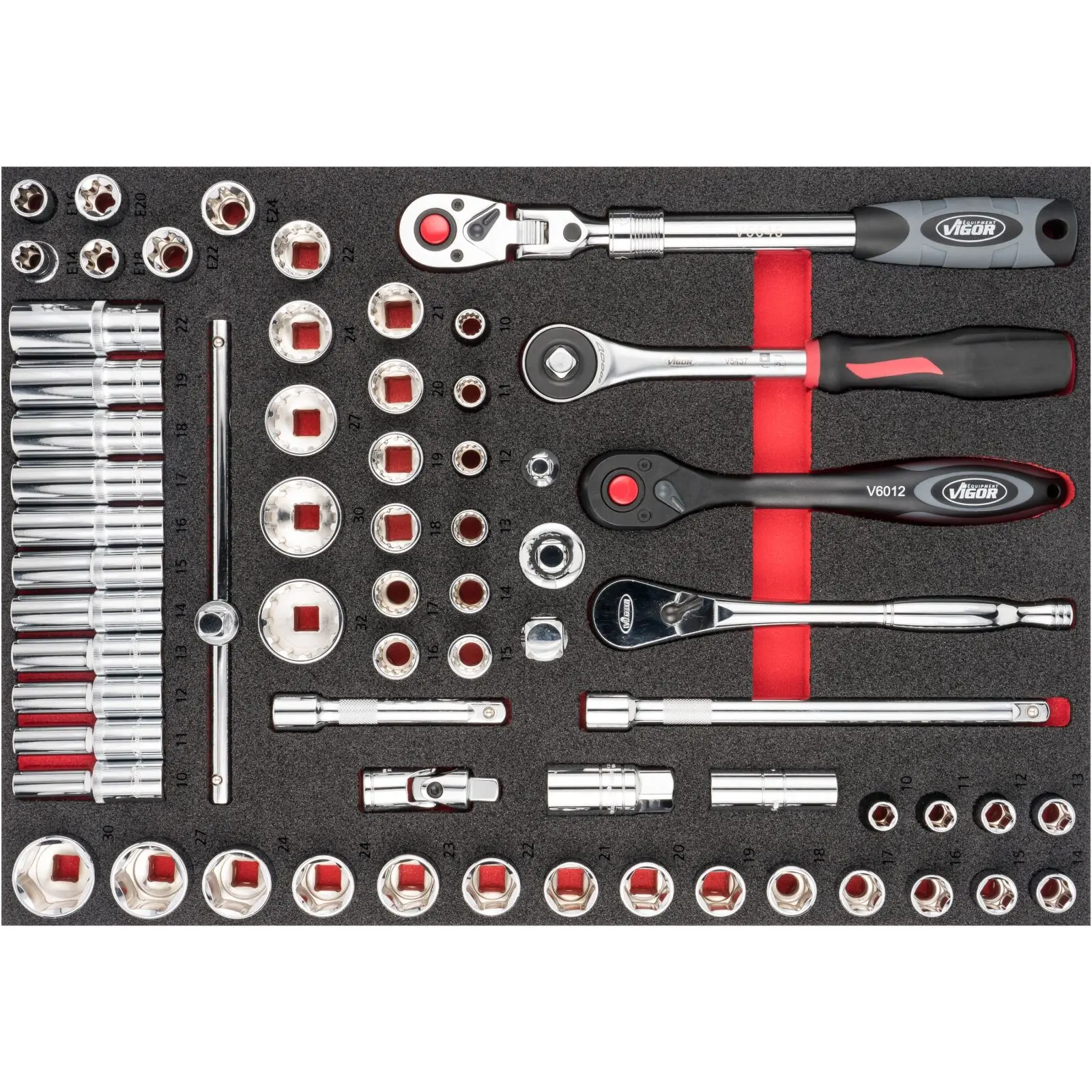 Penová vložka o rozmeroch (š x h x v) 563 x 393 x 35 mm obsahuje celkom 65 ks profesionálnych nástrčných kľúčov a gola sady 1/2".