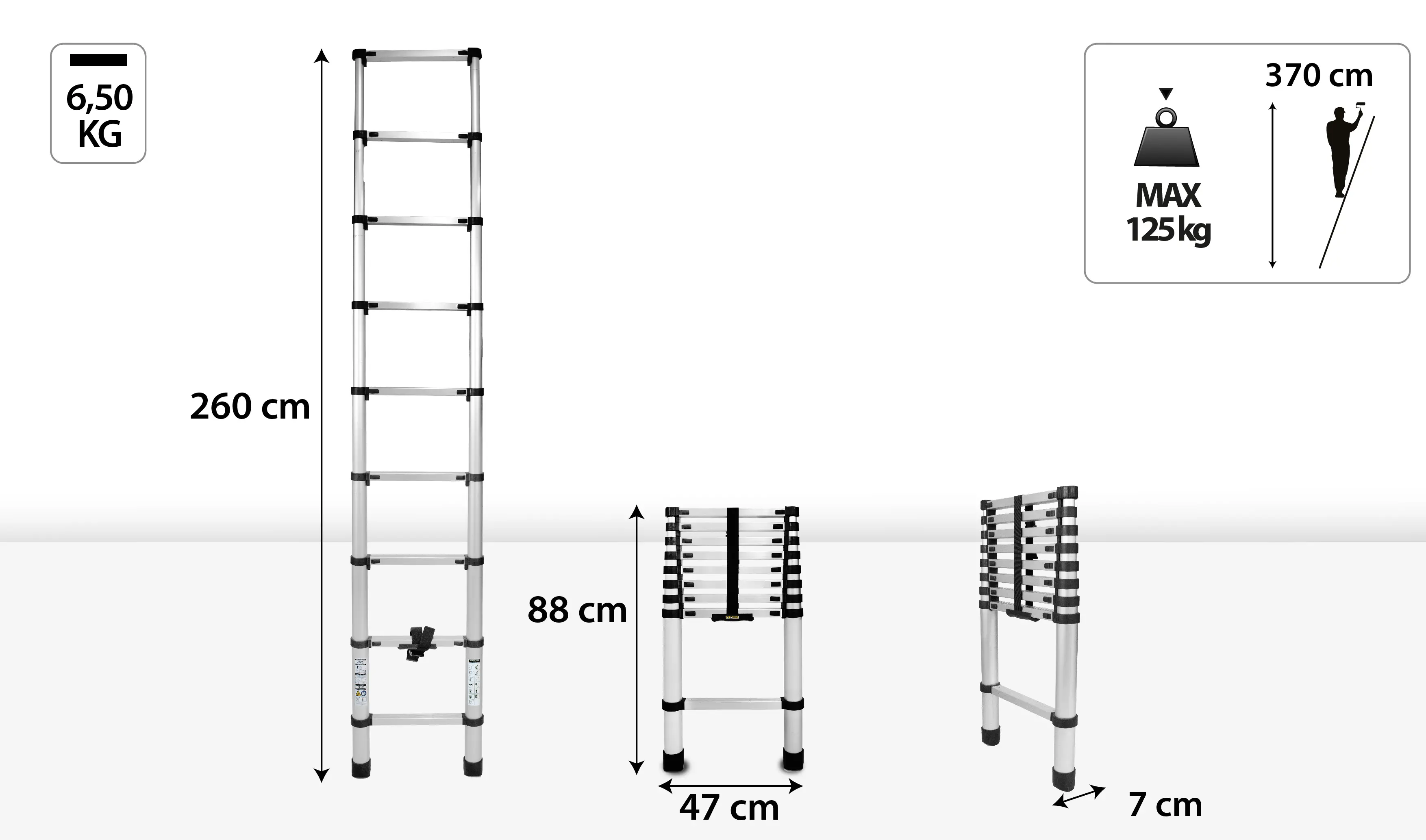 Hliníkový teleskopický rebrík, 9 stupňov, 2,6 m, max. záťaž 125 kg