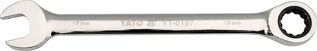 Račňový očkoplochý kľúč YATO 32 mm je na jednej strane klasický stranový kľúč, na strane druhej očkový kľúč s dvanásťhranným profilom vybaveným račňou s jemným delením 72 zubov. Telo kľúča je vyrobené z chromvanadiovej ocele CrV6140. Povrch je vyleštený do vysokého lesku.