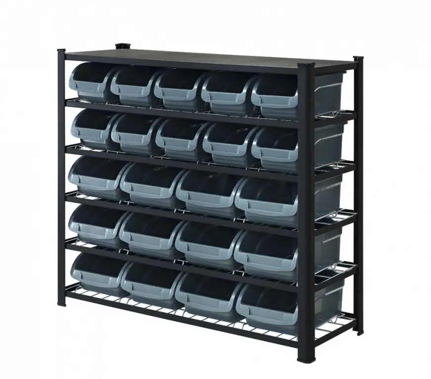 Kovový regál je osadený 6 pozinkovanými drôtenými policami s vodiacími koľajnicami pre plastové boxy. Samotné uskladňovacie nádoby sú z odolného plastu pre dlhú životnosť a sú uzpôsobené pre ľahké vkladanie a odoberanie obsahu.