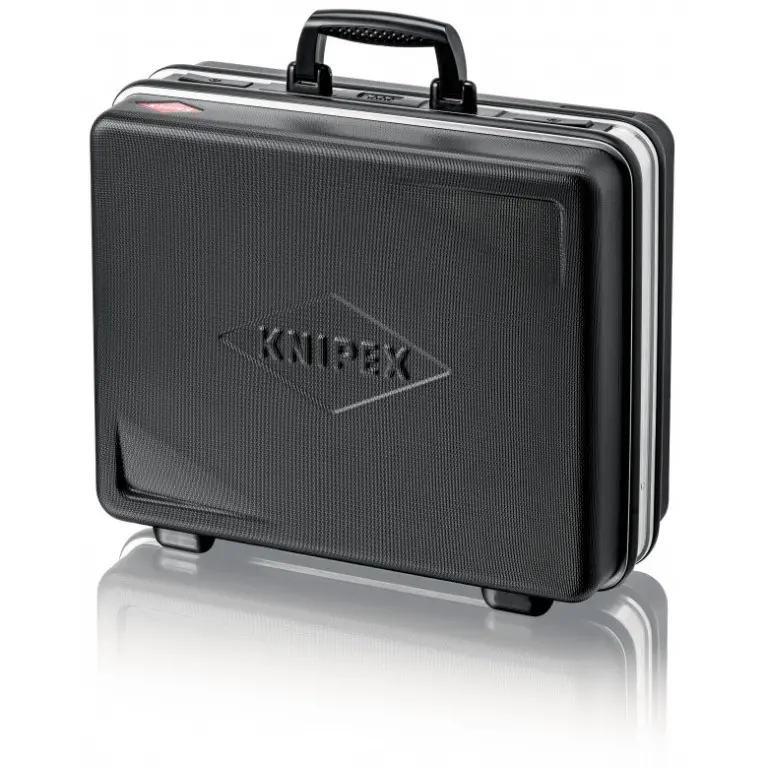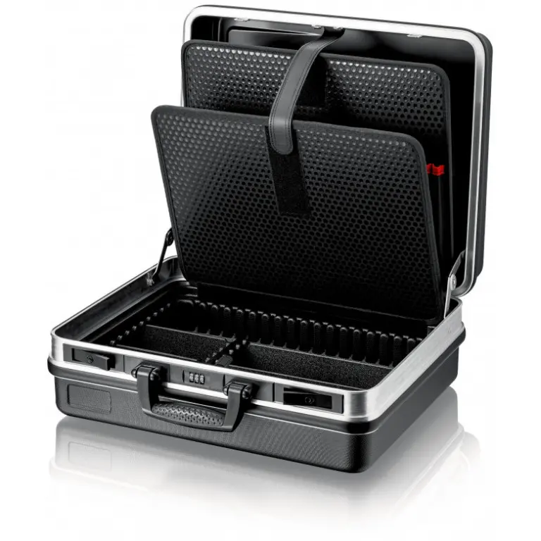 Miska dna, výška 55 mm, ďalej deliteľné vložkami a krycie veko s dvanástimi veľkými vreckami na náradie a plochá zásuvka, upevniteľná patentkou
