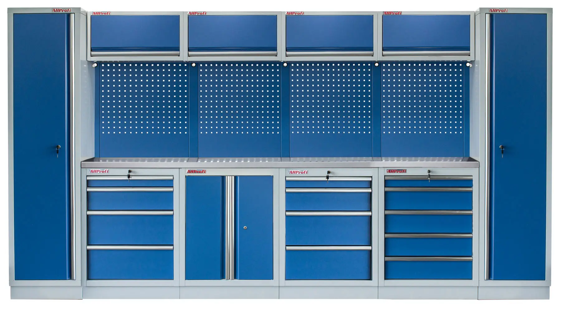 Dielenský nábytok PROFI BLUE s nerezovou doskou zaujme moderným a profesionálnym vzhľadom. Kombinácia modrej RAL 5023 a šedej RAL 7035 sa bude vynímať v každej garáži aj dielni. Zostava nábytku v sebe skrýva dostatočné množstvo úložného priestoru pre vaše náradie, autotechniku aj dielenské vybavenie. V kombinácii s robustnou pracovnou doskou získate multifunkčnú stenu, s ktorou vám práca pôjde od ruky vo všetkých smeroch. Jednotlivé komponenty sú plne konfigurovateľné, zostavu je možné podľa vašich potrieb rozšíriť o ďalšie skrine, regály aj pracovné stoly.Zostava nábytku MTGS1300A88