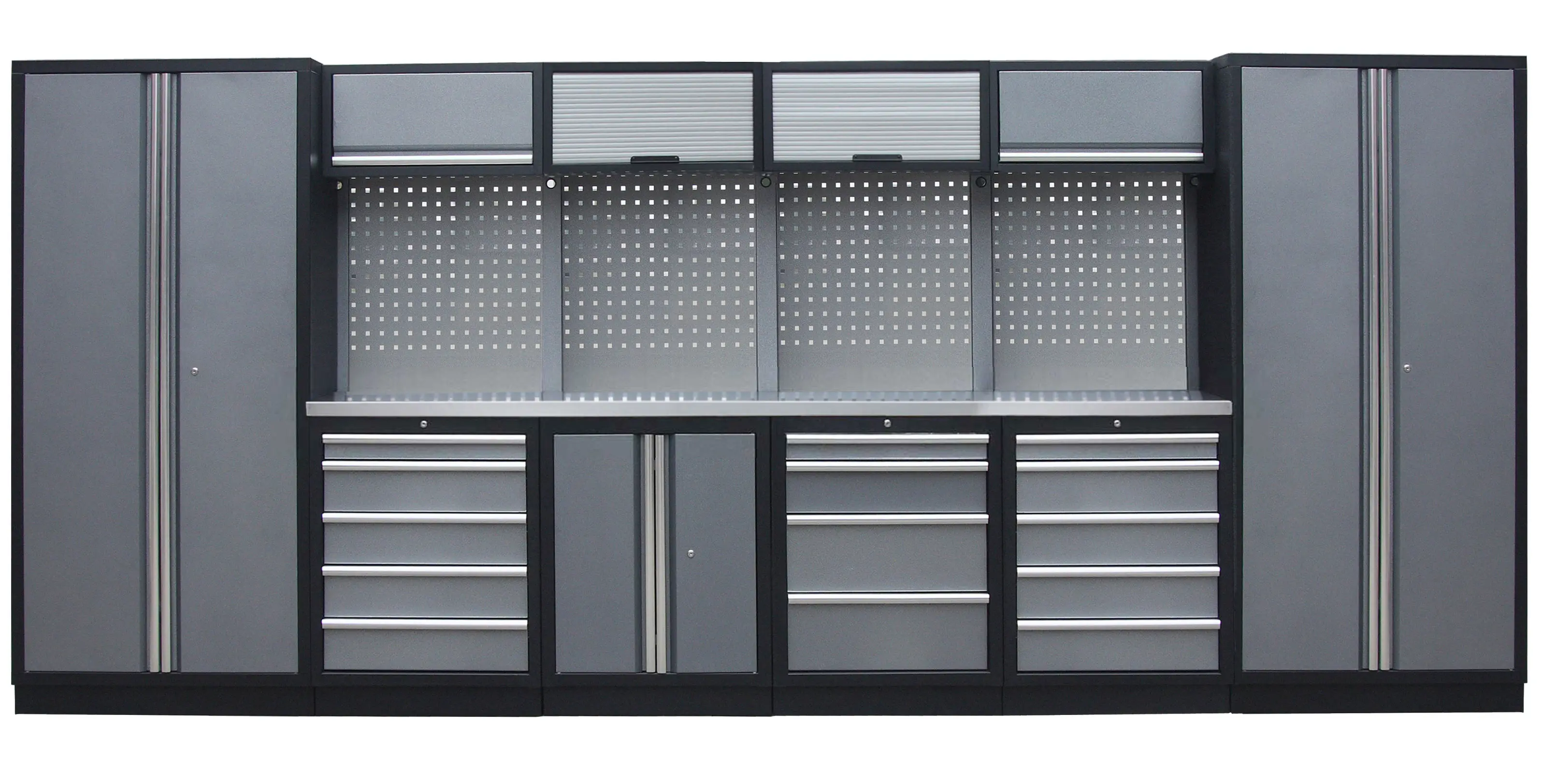 Dielenský nábytok PROFI GREY s nerezovou doskou zaujme moderným a profesionálnym vzhľadom. Kombinácia kladívkovo sivej RAL 3031 a čiernej RAL 9004 sa bude vynímať v každej garáži aj dielni. Zostava nábytku v sebe skrýva dostatočné množstvo úložného priestoru pre vaše náradie, autotechniku aj dielenské vybavenie. V kombinácii s robustnou pracovnou doskou získate multifunkčnú stenu, s ktorou vám pôjde práca od ruky vo všetkých smeroch. Jednotlivé komponenty sú plne konfigurovateľné, zostavu je možné podľa vašich potrieb rozšíriť o ďalšie skrine, regály aj ponk.Zostava nábytku TGS1300AM