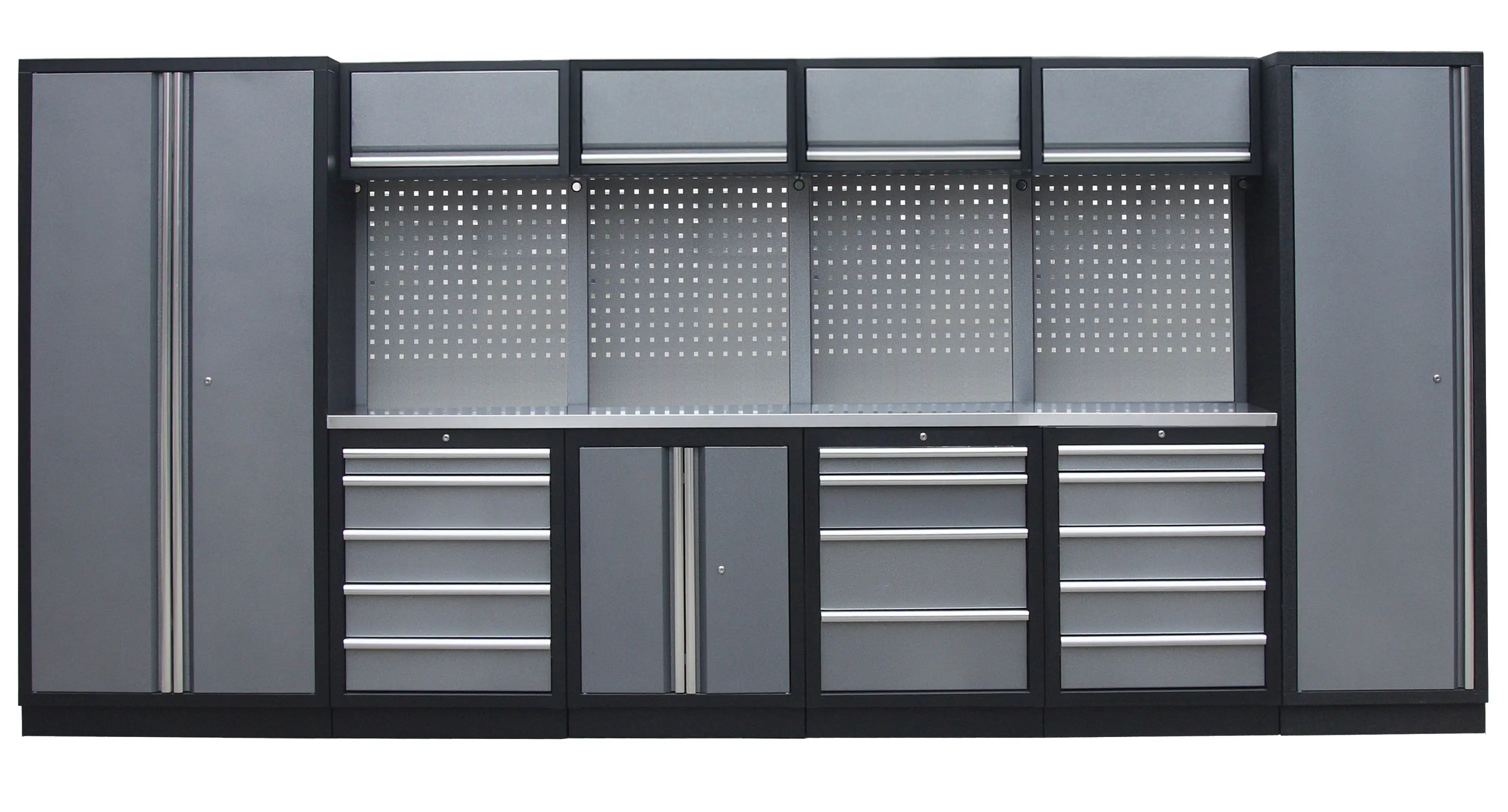 Dielenský nábytok PROFI GREY s nerezovou doskou zaujme moderným a profesionálnym vzhľadom. Kombinácia kladívkovo sivej RAL 3031 a čiernej RAL 9004 sa bude vynímať v každej garáži aj dielni. Zostava nábytku v sebe skrýva dostatočné množstvo úložného priestoru pre vaše náradie, autotechniku aj dielenské vybavenie. V kombinácii s robustnou pracovnou doskou získate multifunkčnú stenu, s ktorou vám pôjde práca od ruky vo všetkých smeroch. Jednotlivé komponenty sú plne konfigurovateľné, zostavu je možné podľa vašich potrieb rozšíriť o ďalšie skrine, regály aj ponk.Zostava nábytku TGS1300AL