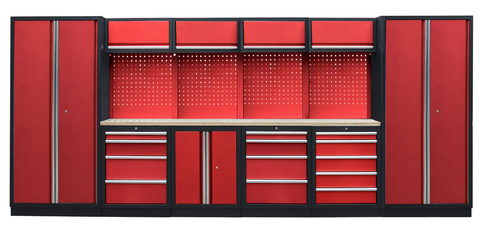 Zostava 21 ks dielenského nábytku PROFI RED s drevenou pracovnou doskou