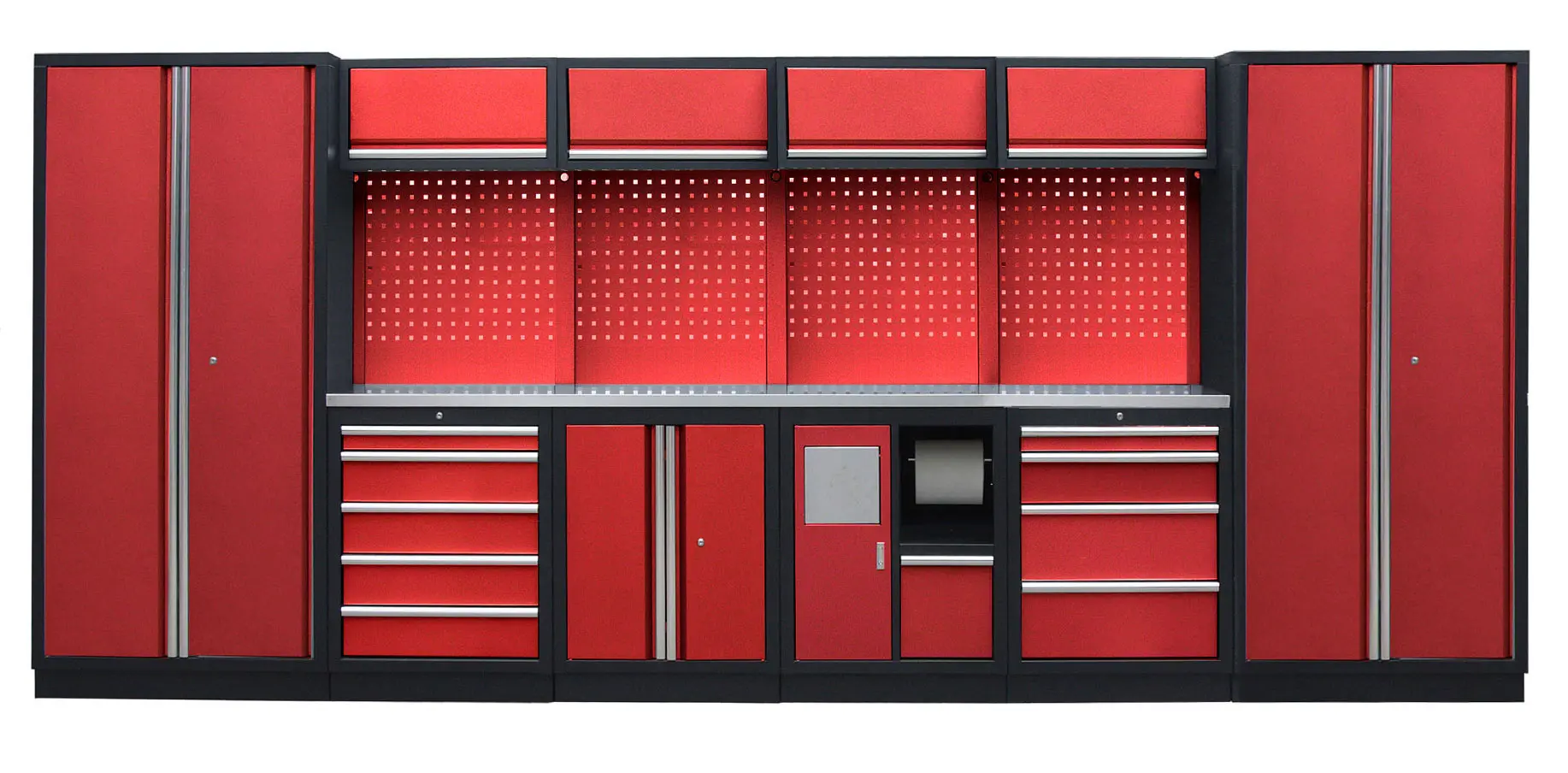 Dielenský nábytok PROFI RED s nerezovou doskou zaujme moderným a profesionálnym vzhľadom. Kombinácia červenej RAL 3031 a čiernej RAL 9004 sa bude vynímať v každej garáži aj dielni. Zostava nábytku v sebe skrýva dostatočné množstvo úložného priestoru pre vaše náradie, autotechniku aj dielenské vybavenie. V kombinácii s robustnou pracovnou doskou získate multifunkčnú stenu, s ktorou vám práca pôjde od ruky vo všetkých smeroch. Jednotlivé komponenty sú plne konfigurovateľné, zostavu je možné podľa vašich potrieb rozšíriť o ďalšie skrine, regály aj pracovné stoly.Zostava nábytku RTGS1301AN