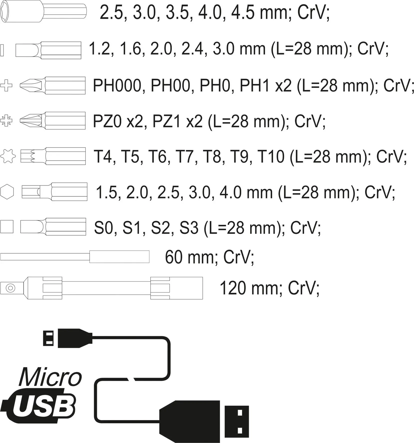 - Hex: 1,5; 2; 2,5; 3; 4 mm.