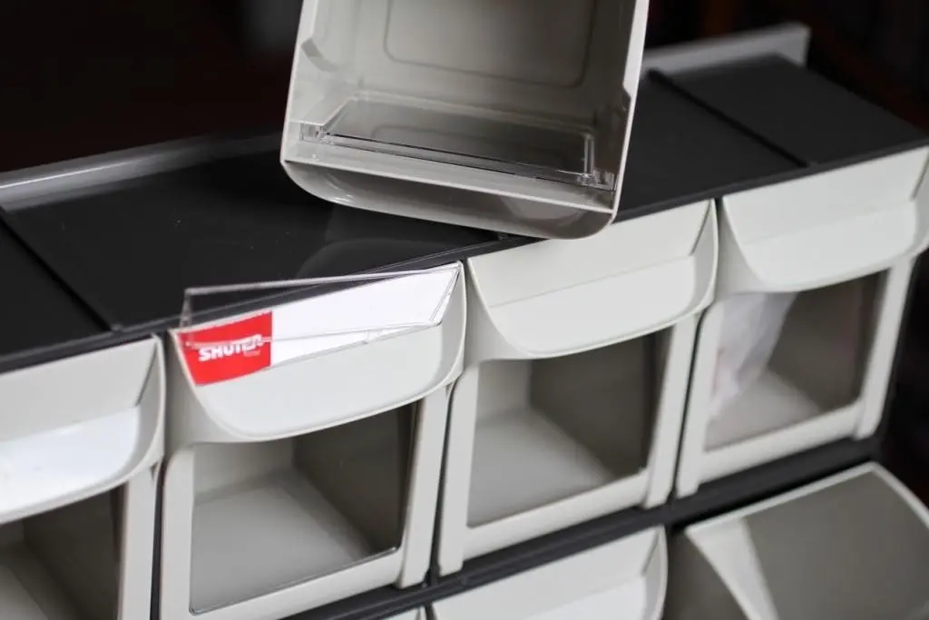 Mobilný organizér na skrutky do dielne o rozmeroch 690×560×1460mm.