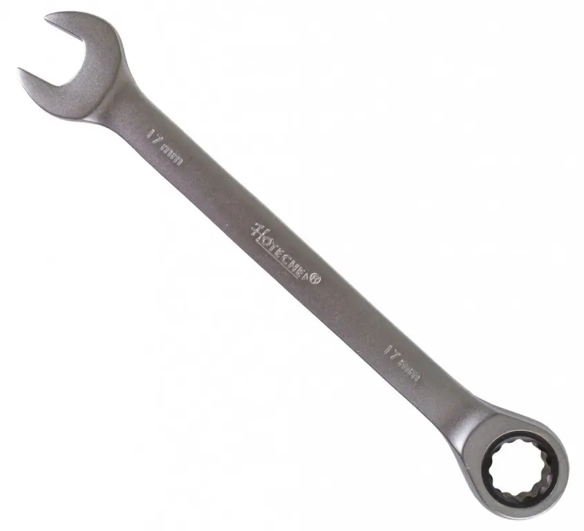 Račňový očkoplochý kľúč od značky Hoteche o rozmere 17 mm je na jednej strane klasický stranový kľúč, na strane druhej prstencový kľúč s dvanásťhranným profilom vybaveným račňou s jemným delením 72 zubov. Celková dĺžka kľúča je 220 mm.