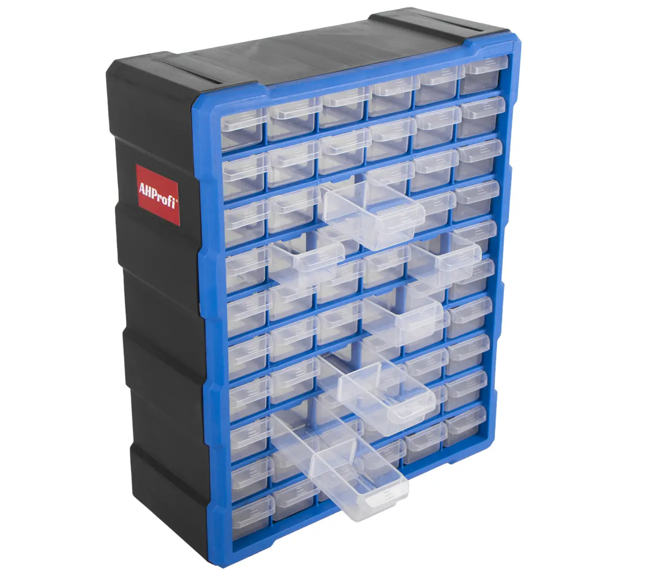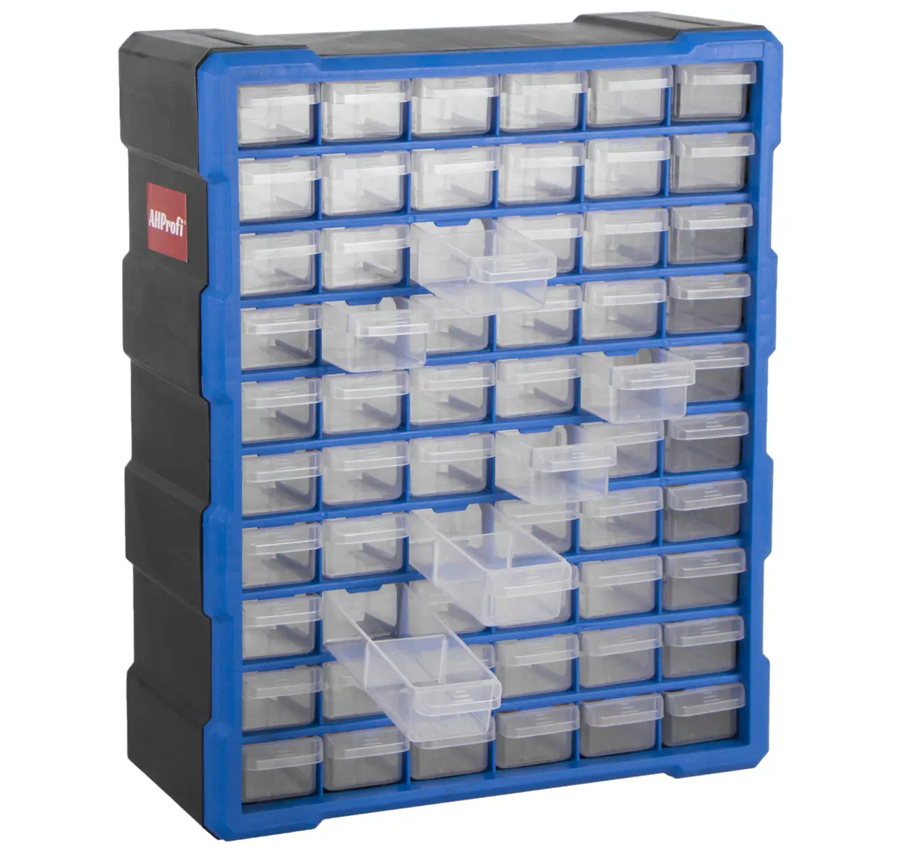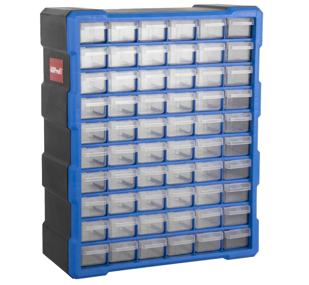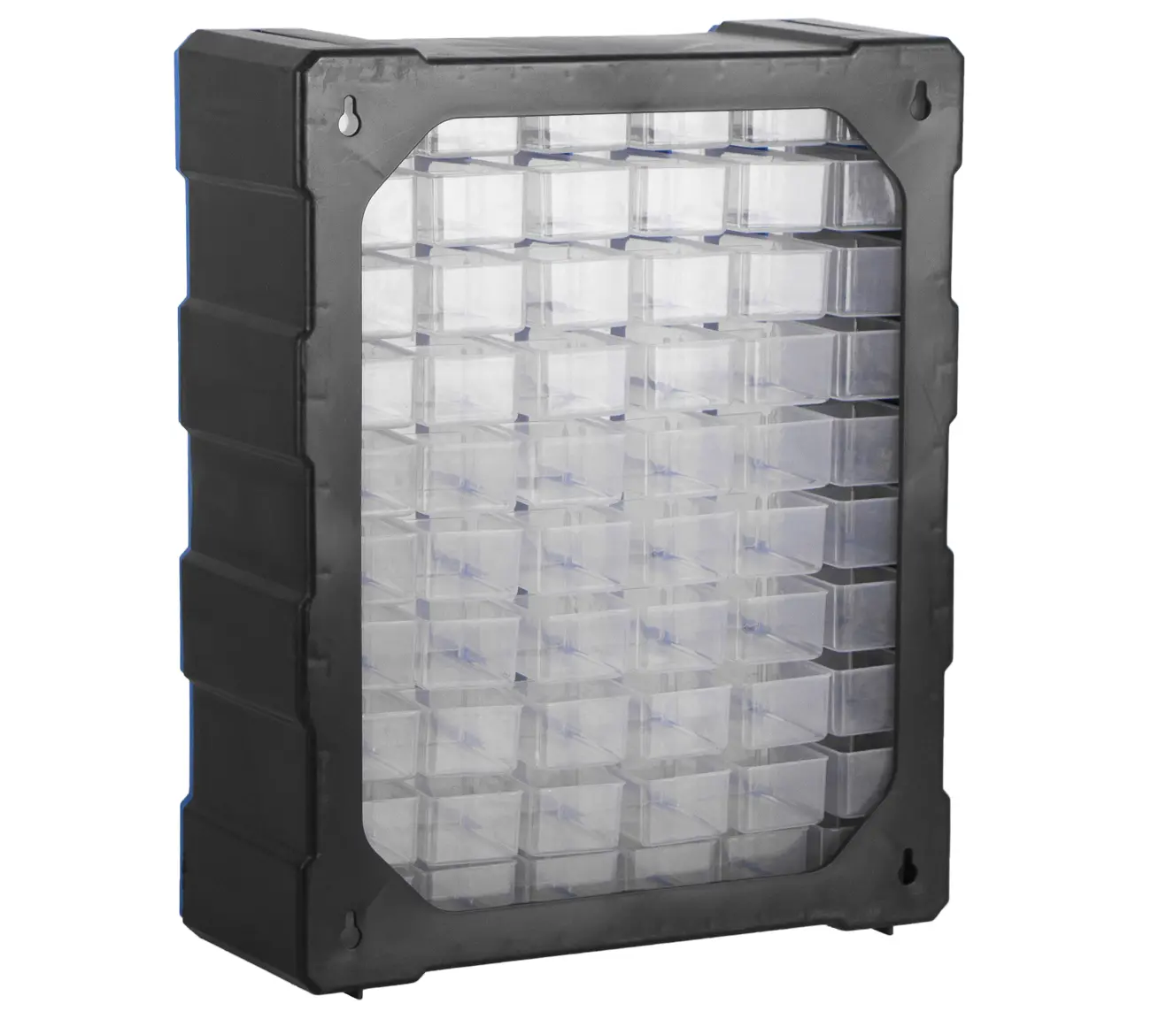 Plastový organizér s 60 zásuvkami je možné jednoducho zavesiť na stenu, alebo napr. z boku skrine, dielenského vozíka a pod. Je možné ho postaviť na ponk, alebo pracovný stôl a slúži pre uloženie montážneho materiálu a drobného dielenského vybavenia.