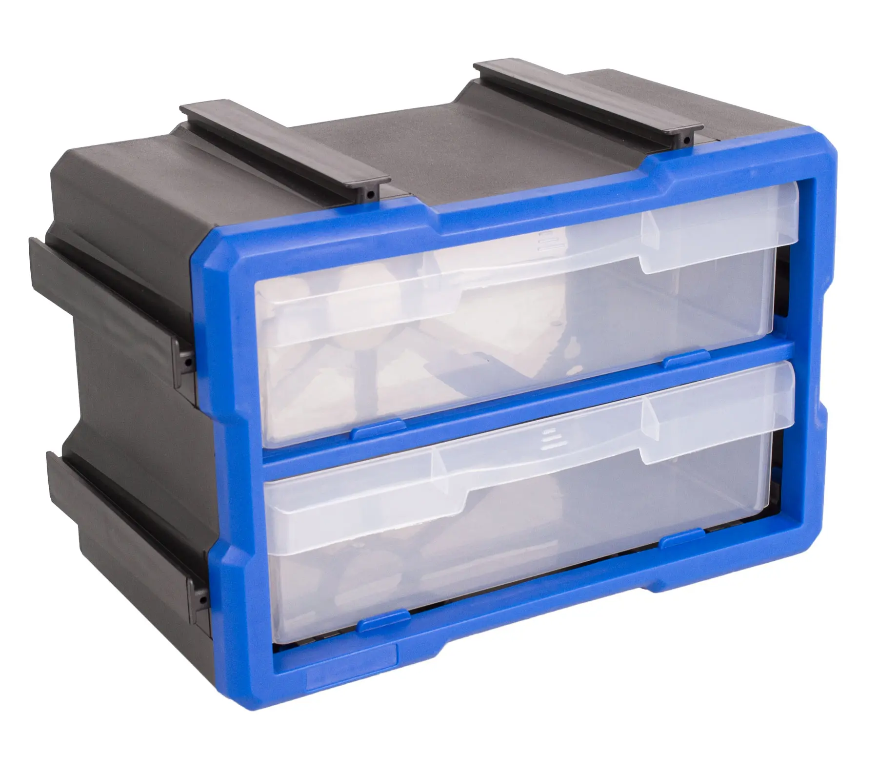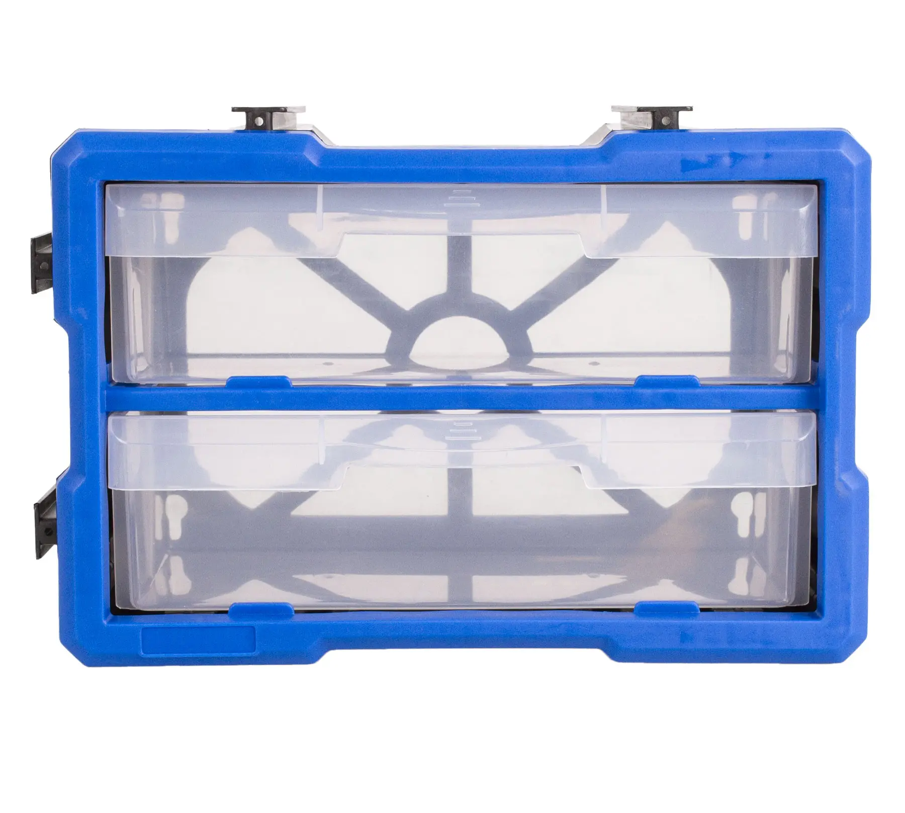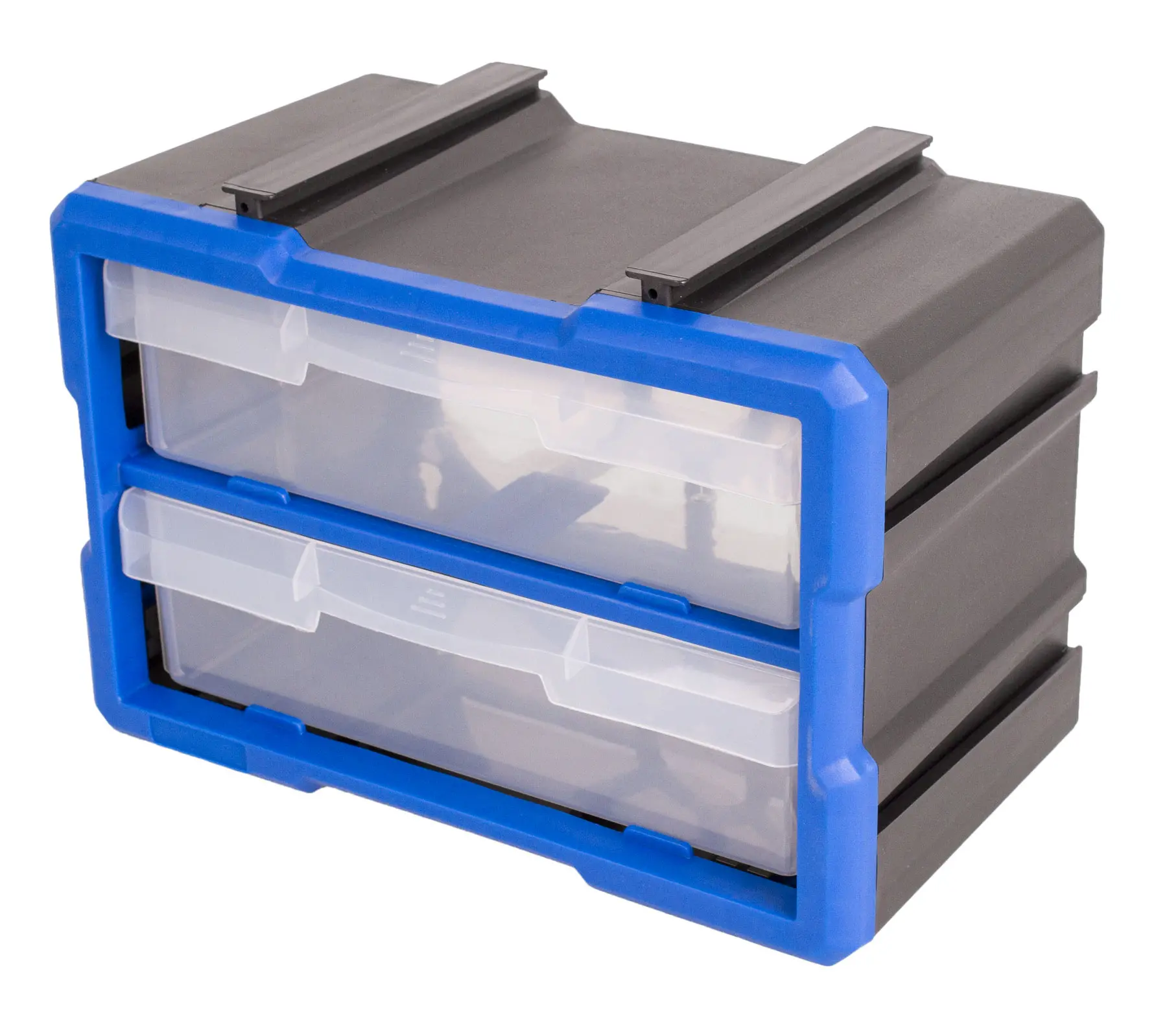 Plastový organizér s dvomi veľkými priehľadnými boxami, vhodný napr. pre uskladnenie a prehľadné rozdelenie skrutiek, matíc a ďalľieho náradia, ktoré by sa mohlo zakotúľať a stratiť. Každý box má jednu prepážku, ktorú je možné vybrať, takže si u každého boxíku môžete vybrať, či chcete jedno alebo dve skladovacie miesta.