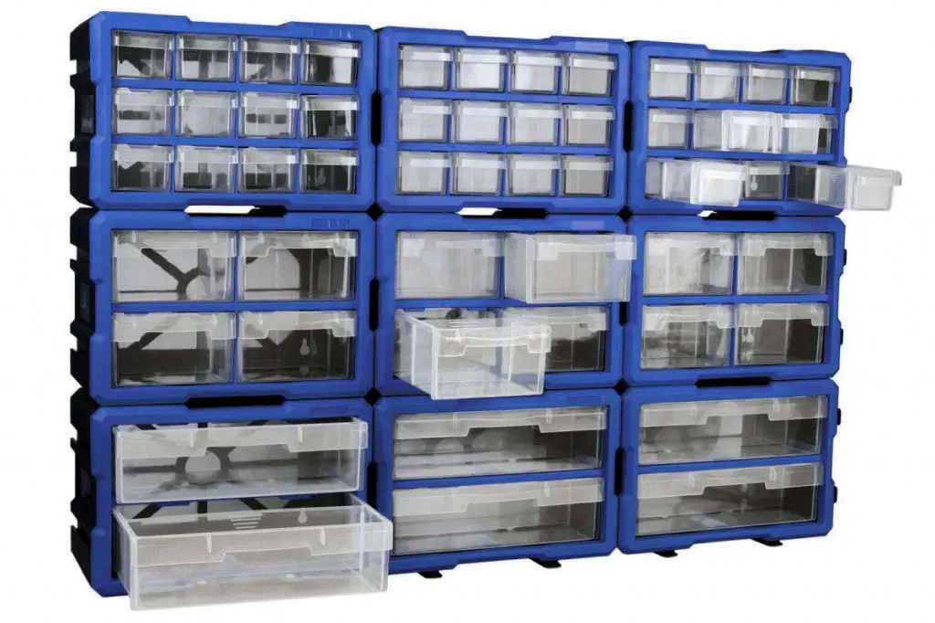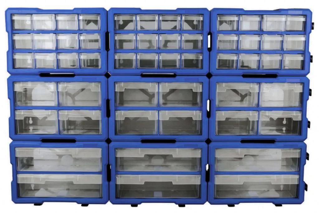 Možno kúpiť rovnoaký organizér i s iným počtom boxov: 4 boxy a 12 boxov. Plastové organizéry sú ľahko pripojiteľné a môžete organizéry zložiť a poskladať podľa vaších predstáv (urobiť z nich "stenu", v ktorej budete mať pekne uskladnené, a prehľadne rozdelené napr. skrutky, matice, či iné drobné náradie, viz. obrázky).