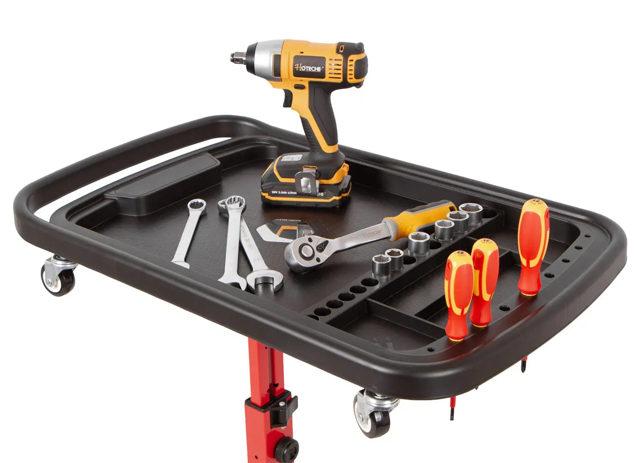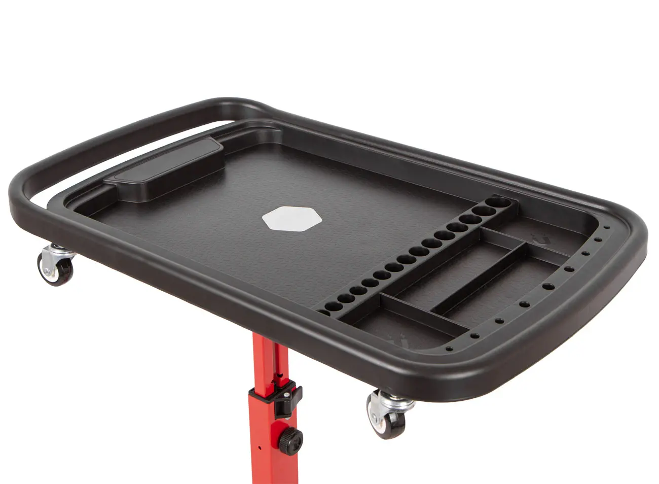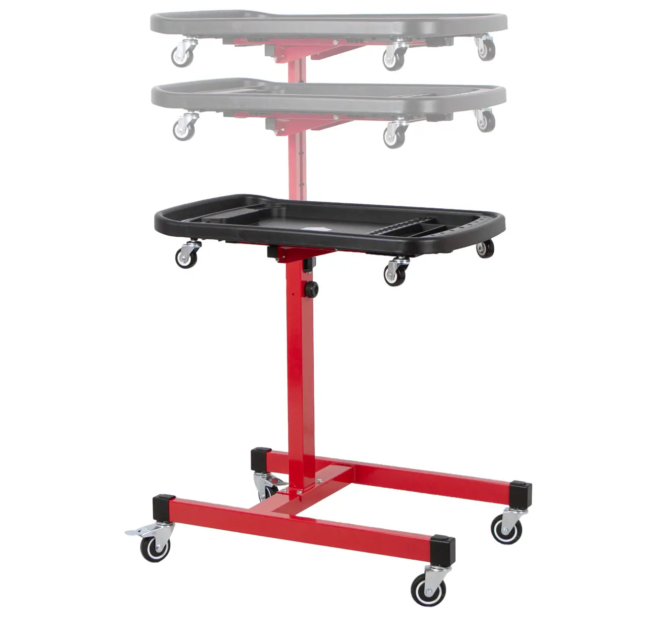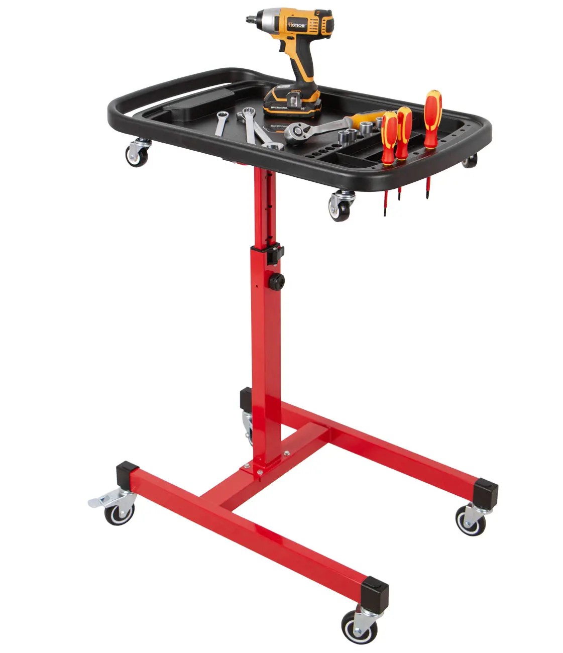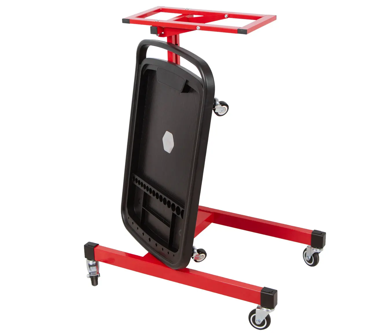 Pojazdný odkladací montážny stolík na organizáciu náradia a drobných súčiastok pri práci v dielni, garáži aj mimo nej.