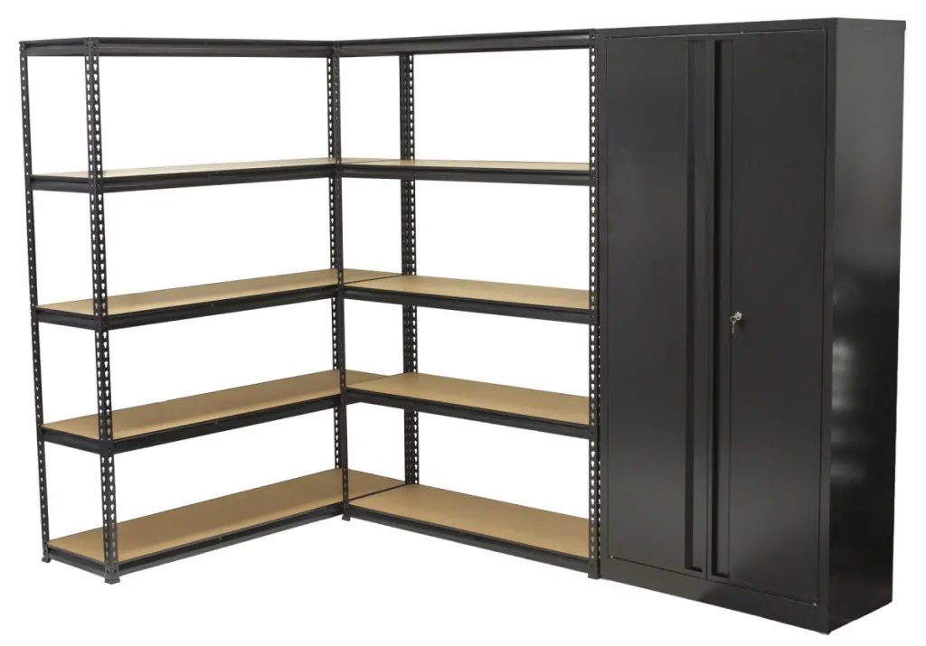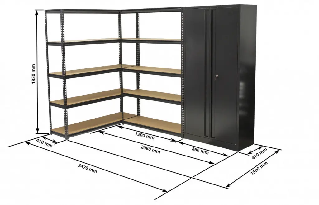 Regálový systém obsahuje klasický rovný regál o šírke 1500 mm, rovný regál a šírke 1200 mm a uzamykateľnú dílenskú skriňu o šírke 860 mm.