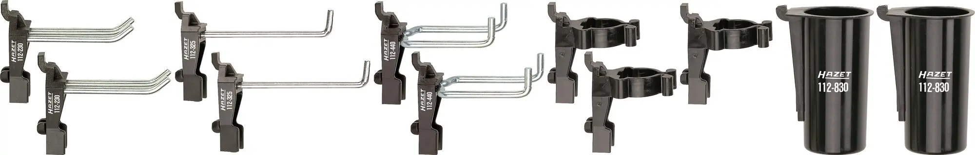 Sada 11 ks hákov a držiakov pre dierované dosky s roztečí 38 x 38 mm. Pripevnením na perforovaný panel je možné rozšíriť úložný priestor aj pre zostavy dielenského nábytku, dielenské vozíky s náradím aj bez náradia, pracovné stoly aj policové regály.