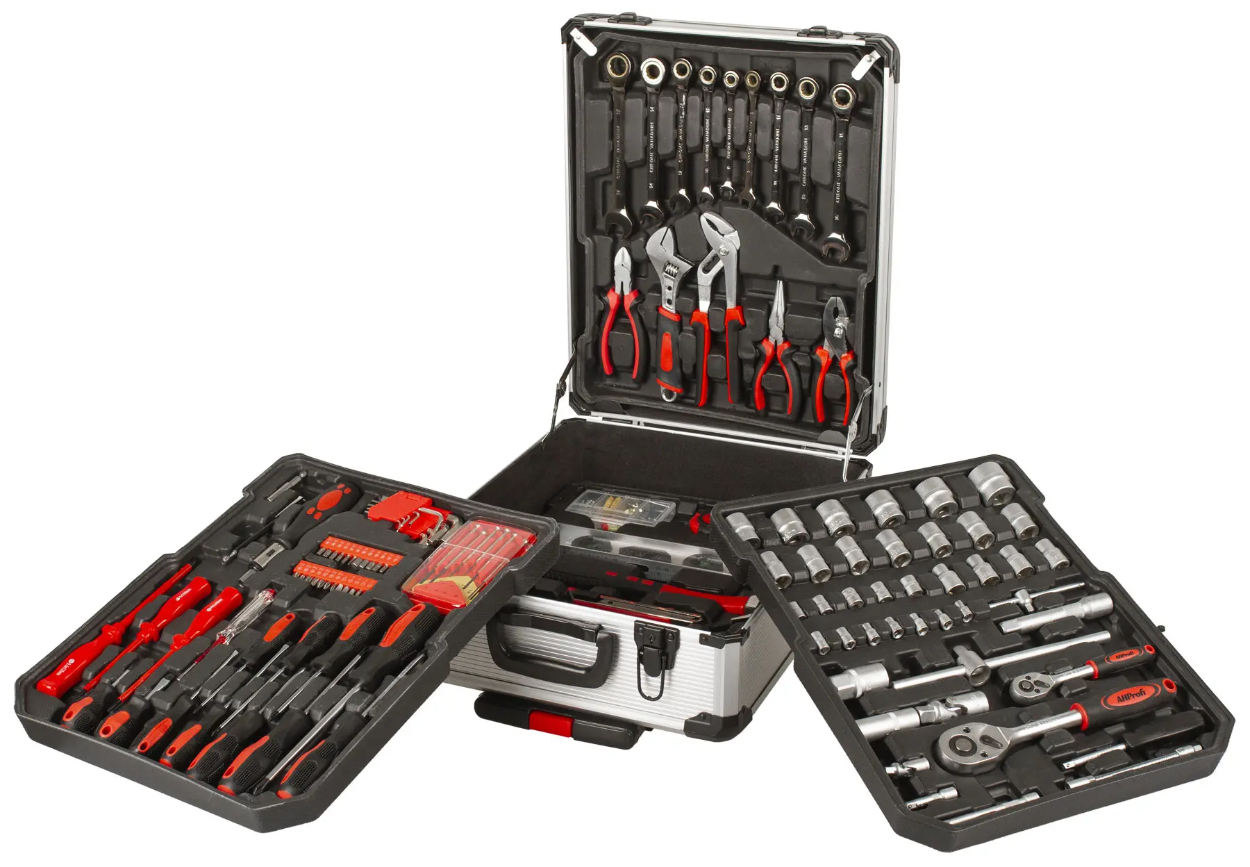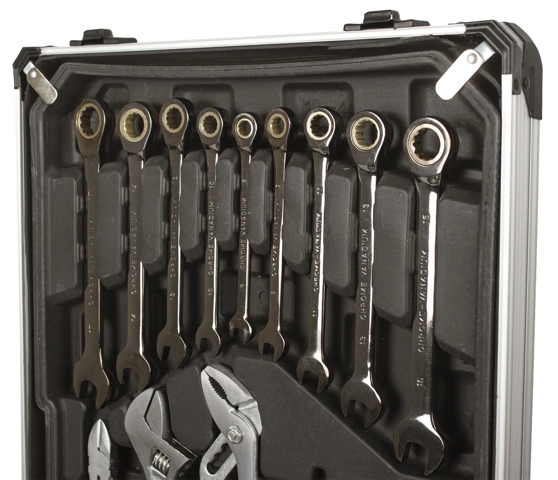 Račňové očkoploché kľúče. Hliníkový kufor vybavený 187 kusmi náradia, náradie z Chróm-Vanadia, ob...
