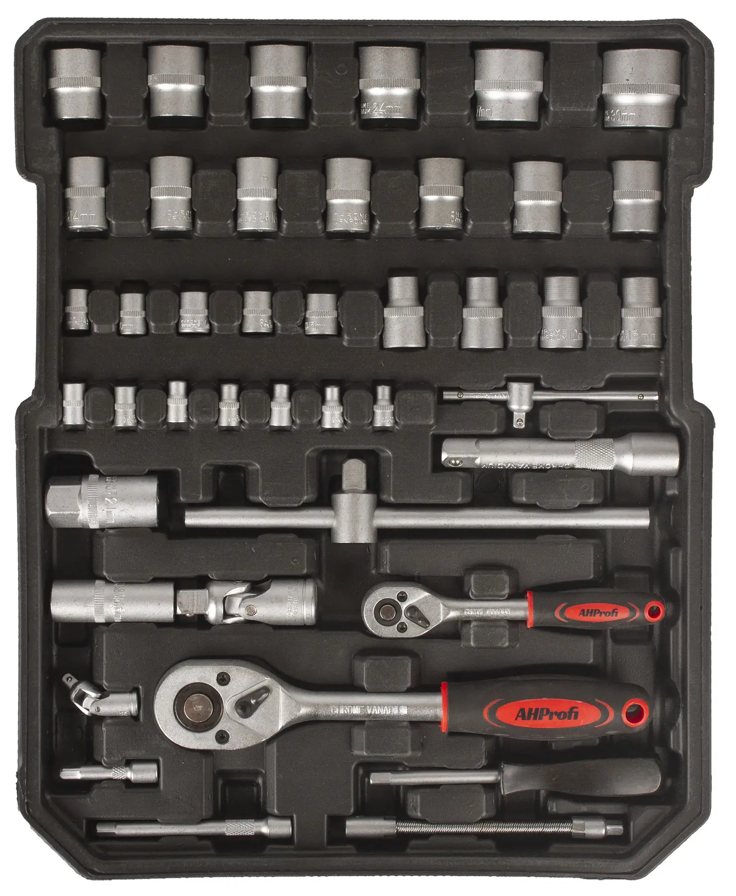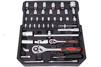 Náradie zo zliatiny Cr-V v matnom prevedení je prehľadne uložené v 4 vyberateľných plastových platoch, ktoré umožňujú rýchlu orientáciu aj jednoduché prenesenie vybranej časti výbavy na miesto práce. Ergonomické rukoväte z kombinácie gumy a plastu zabezpečujú pohodlný úchop pri práci.