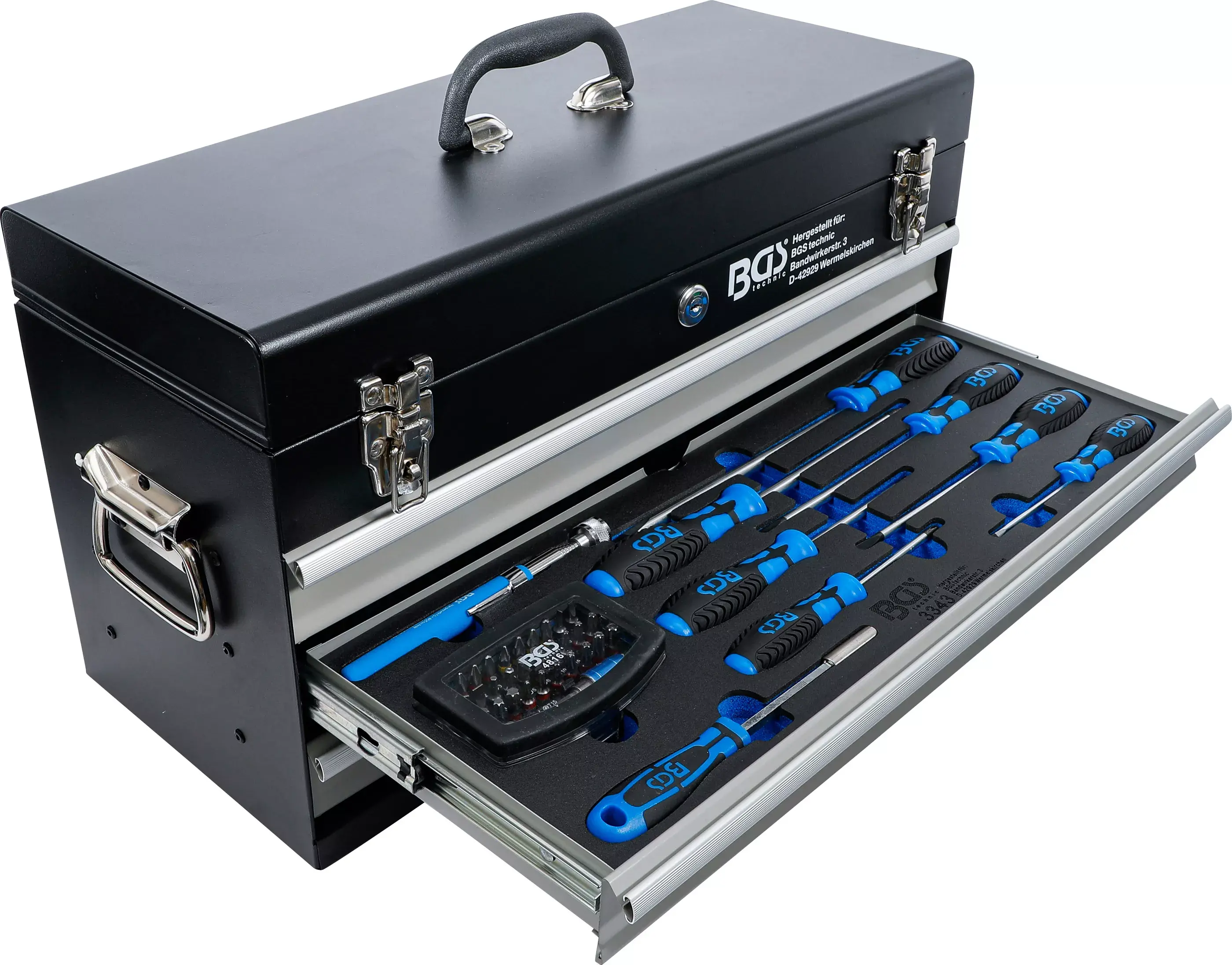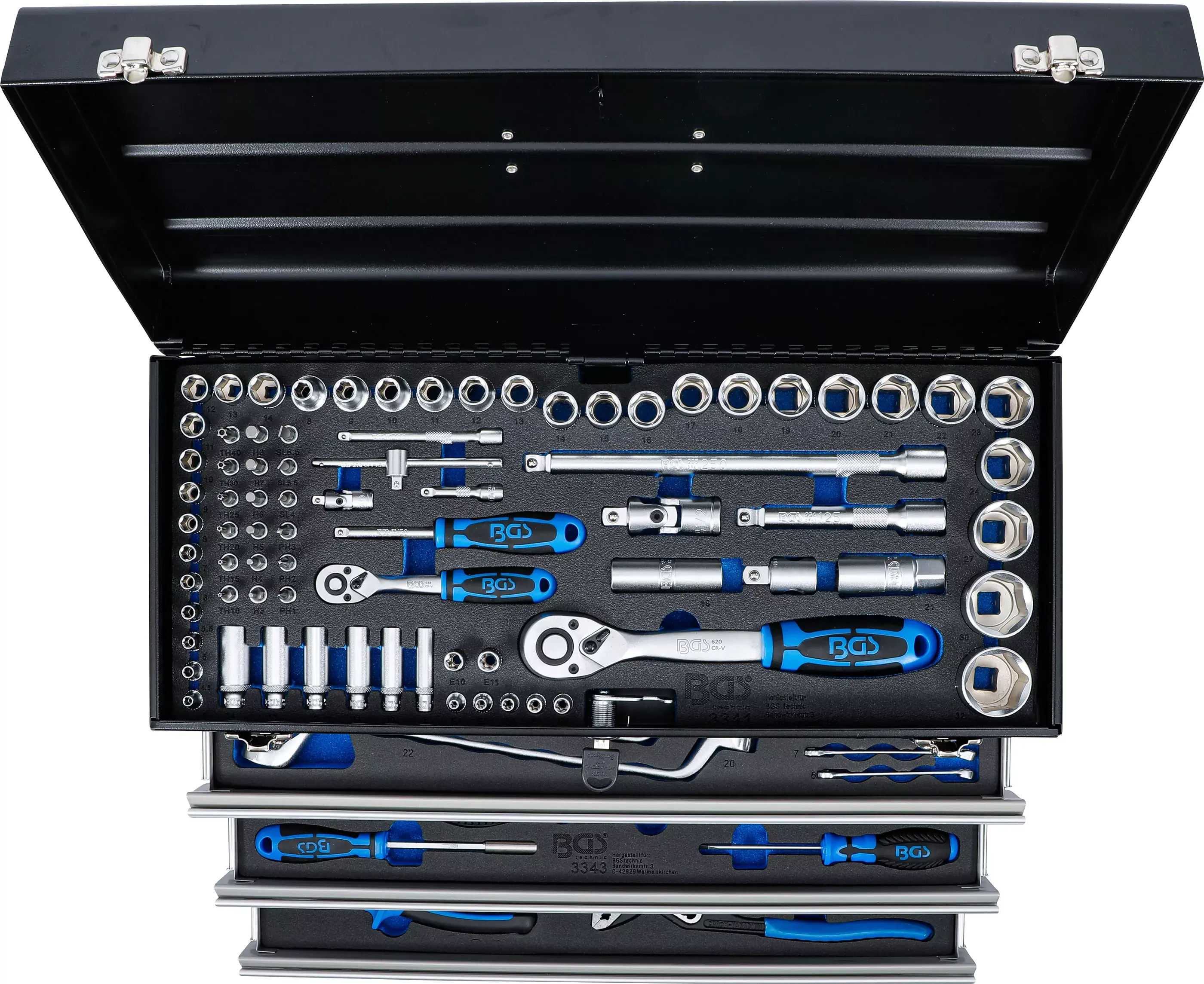 Profesionálna sada náradia BGS v uzamykateľnom kovovom kufri s tromi zásuvkami je určená pre autoservisy, dielne aj domáce použitie.