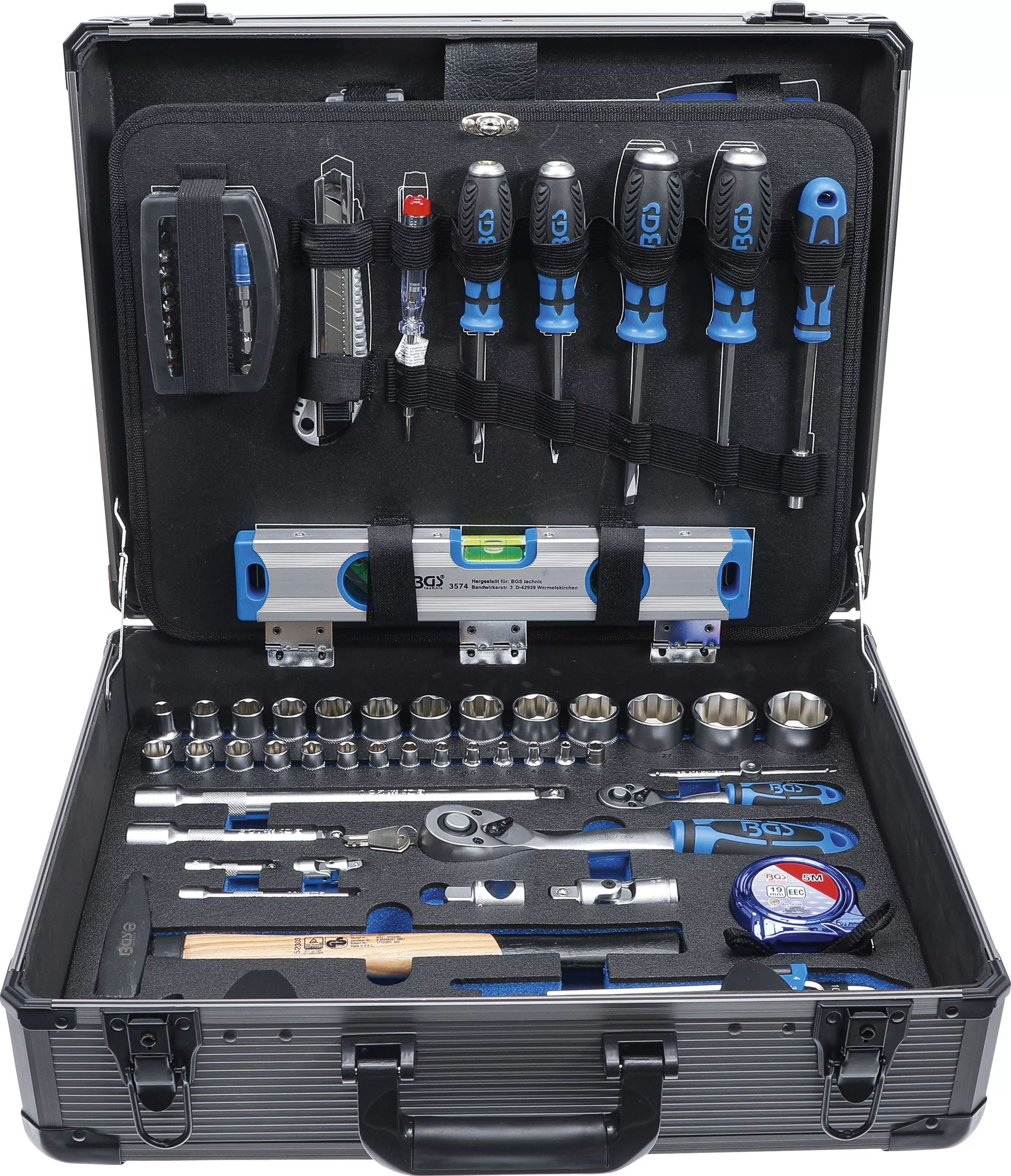 Kompletná sada náradia v hliníkovom kufri značky BGS, určená pre domáce dielne, servisné a montážne práce. Obsahuje prehľadne usporiadané nástroje na skrutkovanie, meranie, rezanie, strihanie aj úderové operácie.