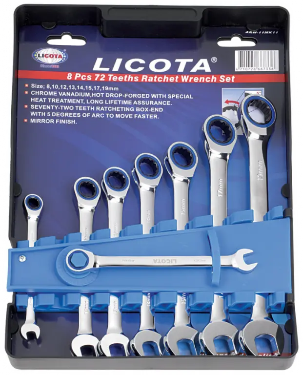 Sada očkoplochých račňových kľúčov Licota obsahuje 8 račňových kľúčov, ktoré sú ideálne na prácu v obmedzených priestoroch.