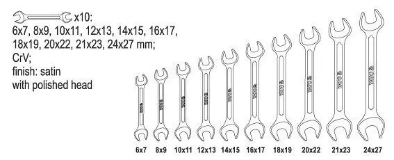 Sada 10 kusov stranových kľúčov 6 - 27 mm vyrobených z kvalitnej chróm vanádiovej zliatiny ocele, uložených v odolnom puzdre zo silnej syntetickej tkaniny, umožňujúce zavesenie.