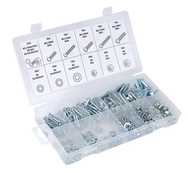 V balení nájdete základné veľkosti skrutiek, matíc a podložiek, ktoré nájdu využitie v každej dielni alebo garáži.