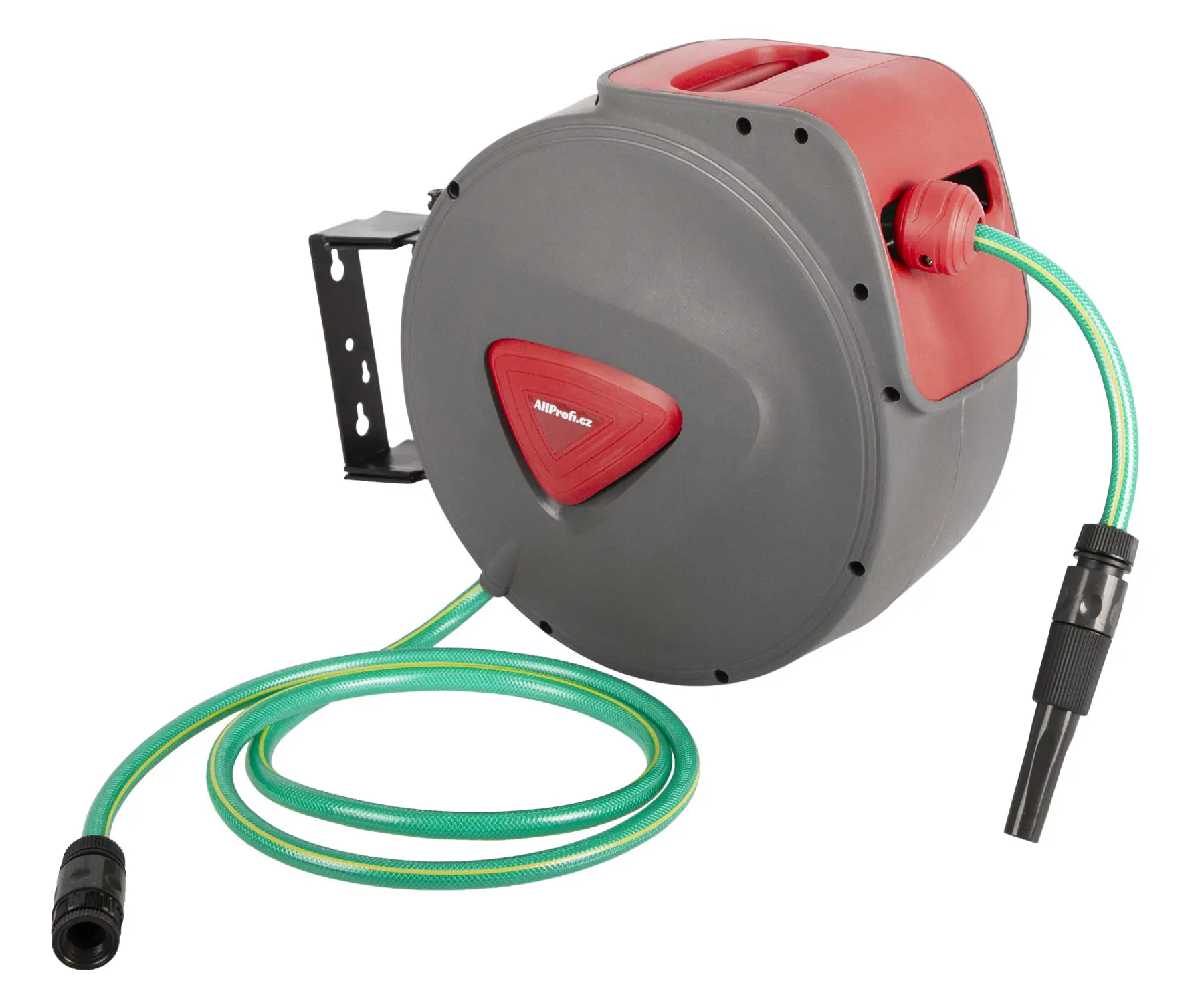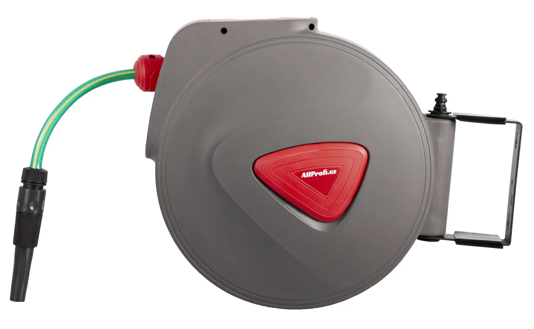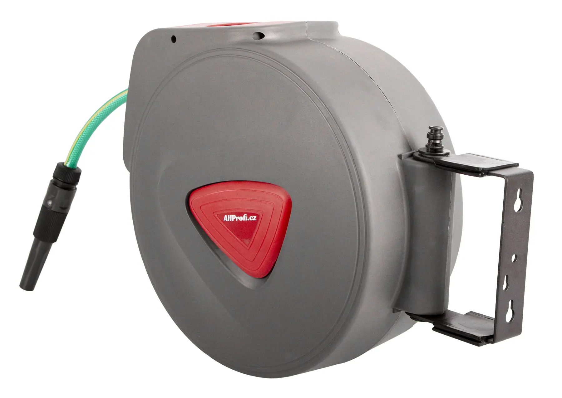 Samonavíjací bubon z odolného plastu s 20 metrovou vysokotlakovou hadicou na vodu, hadica ukončen...