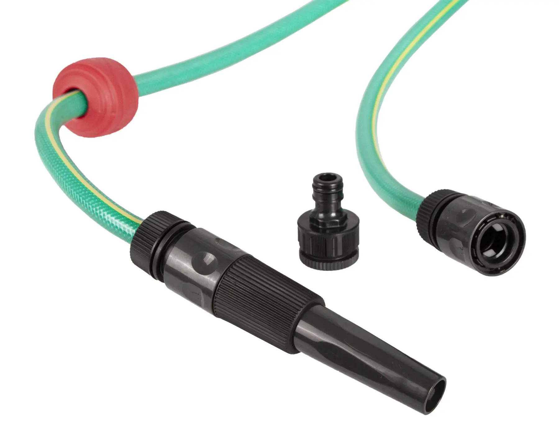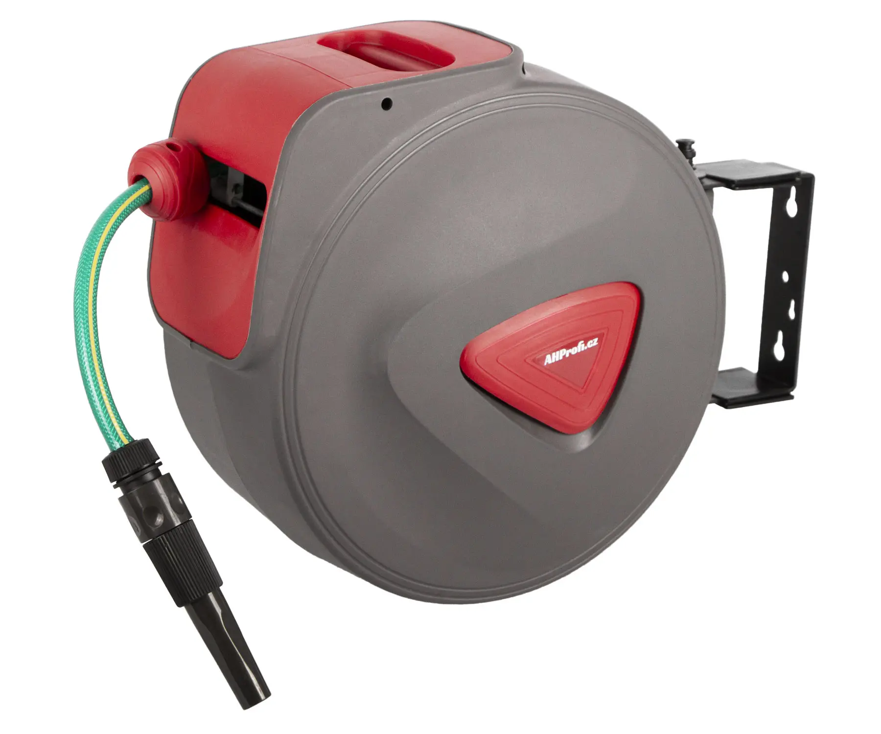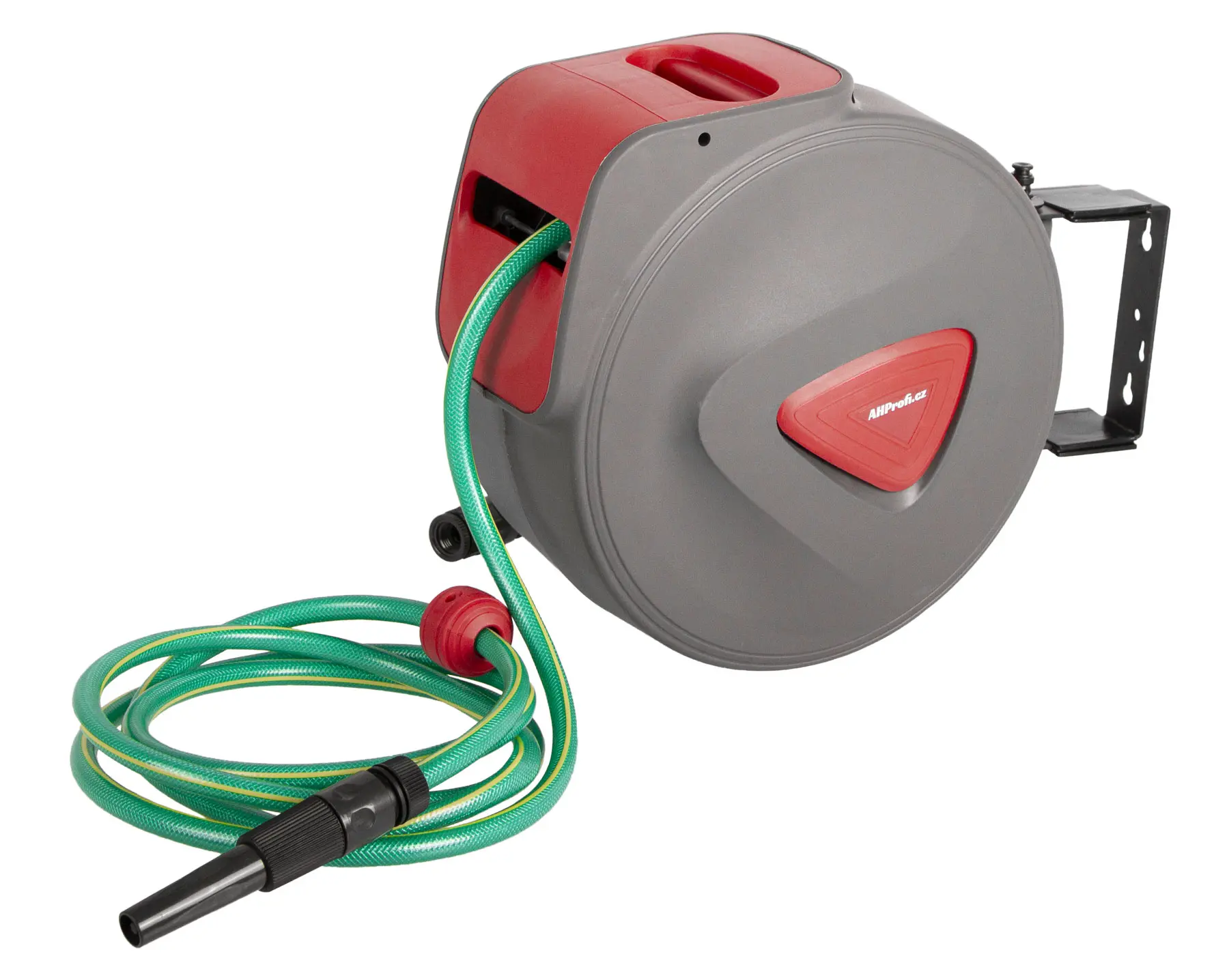 Samonavíjací bubon z odolného plastu s 20 metrovou vysokotlakovou hadicou na vodu, hadica ukončen...