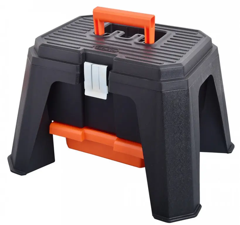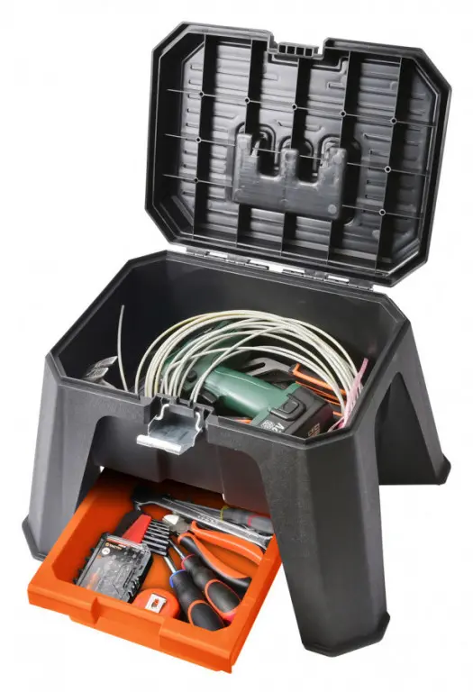 Plastové dielenské sedátko/stúpadlo s úložným priestorom a pevnou konštrukciou.