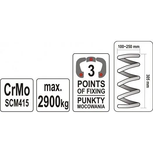 Sila 2,9 ton, rozsah 305 mm, rozsah čeľustí 100 - 250 mm.